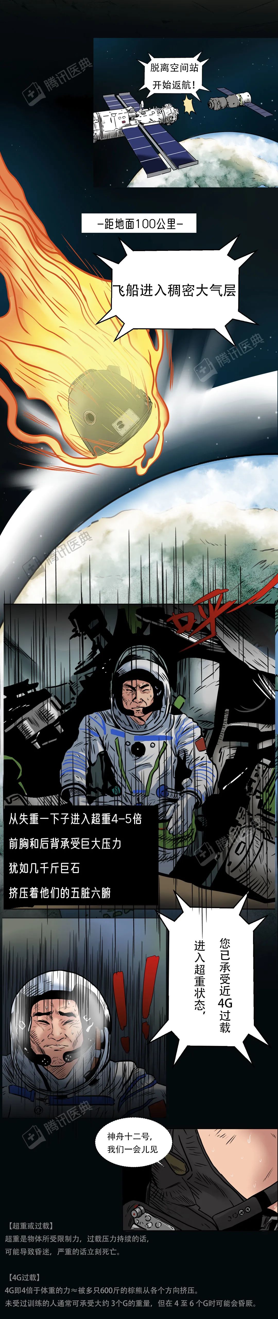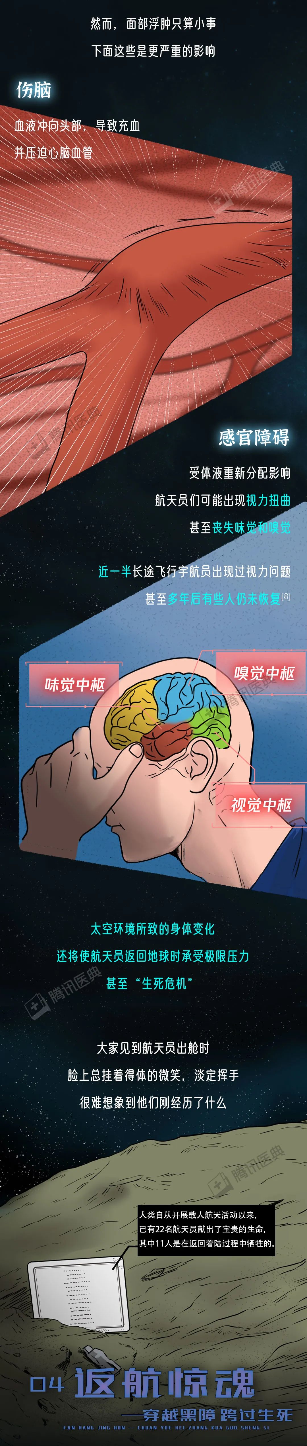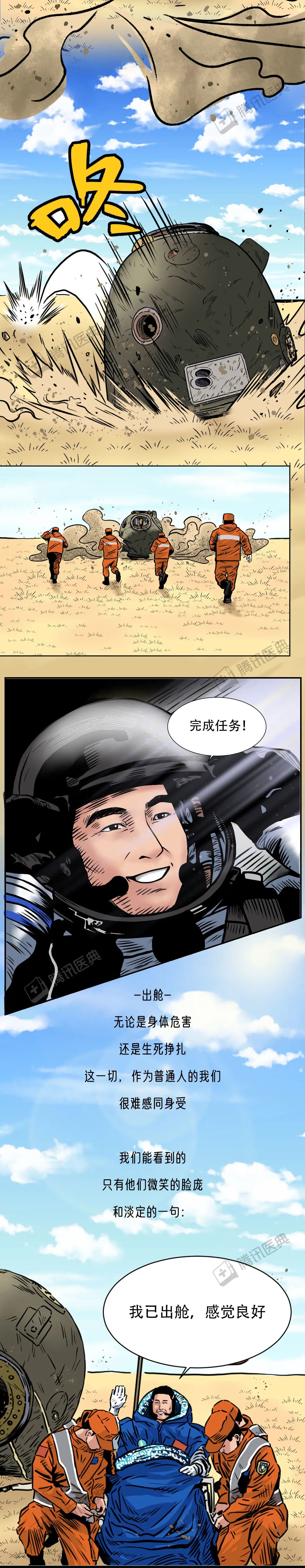 苟利国家生死以 岂因祸福避趋之 致敬航天英雄!国士无双! 特约作者: 牟丹蕾 |北京佑安医院呼吸综合感染科主任医师、医学博士后 王英鹏 |北京航天总医院神经内科主任医师、医学博士后 参考文献 [2]杨利伟. 天地九重[M]. 1. 北京:中国人民解放军出版社, 2010. [4]Rodan GA (1998). "Bone Homeostasis". Proceedings of the National Academy of Sciences. 95 (23): 13361–62. Bibcode:1998PNAS...9513361R. [5]沈羡云.失重飞行对航天员身体的影响及防护措施(上)[J].中国航天,2002(01):24-29. [6]王庭槐. 生理学[M]. 9. 北京:人民卫生出版社, 2018 :8. [7]"NASA Finds that Space Flight Impacts Astronauts' Eyes and Vision". American Academy of Ophthalmology. 2013-07-10. [8]Howell, Elizabeth (3 November 2017). "Brain Changes in Space Could Be Linked to Vision Problems in Astronauts". Seeker. Retrieved 3 November 2017. [9]Elder, Donald C. (1998). "The Human Touch: The History of the Skylab Program". In Mack, Pamela E. (ed.). From Engineering Science to Big Science: The NACA and NASA Collier Trophy Research Project Winners. The NASA History Series. NASA. SP-4219. 条漫策划:球球 | 编辑:郭倩、张杰、叶正兴 设计师:盖括、木子李 排版:韩宁宁 | 校对:武宜和 运营:李永敏 | 统筹:叶正兴