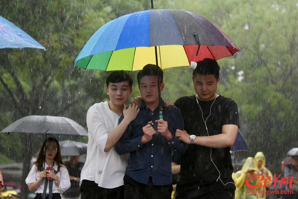 ■4月26日11时,广州遭遇狂风暴雨,在地铁体育中心站A出口,附近财富广场的一名保安员用大雨伞护送市民往返于广场和地铁口之间。新快报记者 孙毅/摄