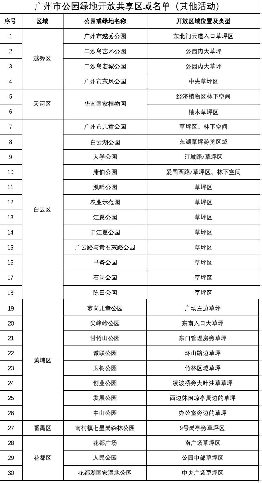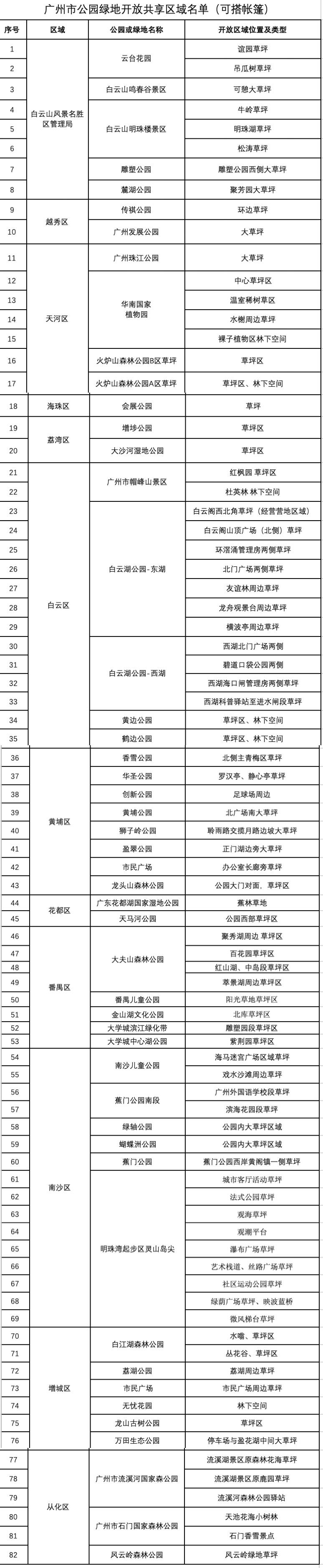 ■新快报记者 王彤 市民建议中心城区公共绿地不许搭帐篷 市林业园林局全面摸查梳理全市各类公园绿地中可供游憩活动的草坪区、林下空间,进一步拓展公园绿地开放共享空间和开放类型,初步形成了名单,并于今年5月4日起通过门户网站公开征求意见。这份名单涵盖了可搭帐篷开放共享区域和可开展其他活动区域的绿地,分别包括73、29个点位。 征求意见期间,市林业园林局共收到社会公众的反馈意见64条。公众意见主要有以下几个方面:建议加强对开放公园绿地的管理;建议增加绿地开放区域;建议在外围城区增加搭帐篷区域;建议加强开放区域配套服务;建议二沙岛、临江大道等中心城区公共绿地不允许搭建帐篷。 临江大道未纳入开放共享区域 相关负责人表示,针对以上意见,该局认真研究,综合各方意见,进一步优化和完善名单,同时加强公园绿地开放共享管理工作。重点加强对开放式公园绿地的管理。科学合理划定开放草坪搭建帐篷区域,在公园绿地显著位置设置告示牌,公布开放草坪的范围和开放时间,指引游客按区域按时间开展活动;联合公安、城管、街道等部门加大巡查执法力度,对违规占用二沙岛等公共绿地开展非法经营活动的现象予以有力打击,非法占用的情况得到一定改善。 相关负责人介绍,正式公布的名单新增开放了流溪河国家森林公园、石门国家森林公园、白江湖森林公园、帽峰山森林公园、南沙灵山岛尖、大学城中心湖公园等多个外围城区公园绿地,加强配套服务。二沙岛部分绿地开放类型也经过了调整,其中艺术公园和宏城公园调整为可以开展铺垫子等其他活动,不作为可搭帐篷区域。临江大道未纳入开放共享区域。 知多D 不得违规占用公园绿地开展非法经营活动 可搭帐篷开放共享区域,指公园开放时间内公园草坪可搭建中小型的家用帐篷。其要求,占地面积小于5平方米,高度不超过1.5米,不得使用脚钉固定。此外,帐篷不能全封闭,要能从外面观察到帐内情况,以便巡防人员发现安全隐患,及时提醒或救助。帐篷内不能有吸烟、烹饪或大声喧哗等不文明行为,共同维护良好的休闲空间。 可开展其他活动的绿地,指只可开展铺设野餐垫、休闲、游憩等户外活动,不开设搭帐篷区域的绿地。针对此前有人利用二沙岛的公共绿地占位营利的行为,名单也特别强调,在草坪活动期间应遵守公园管理相关规定,不得违规占用公园绿地开展非法经营活动。