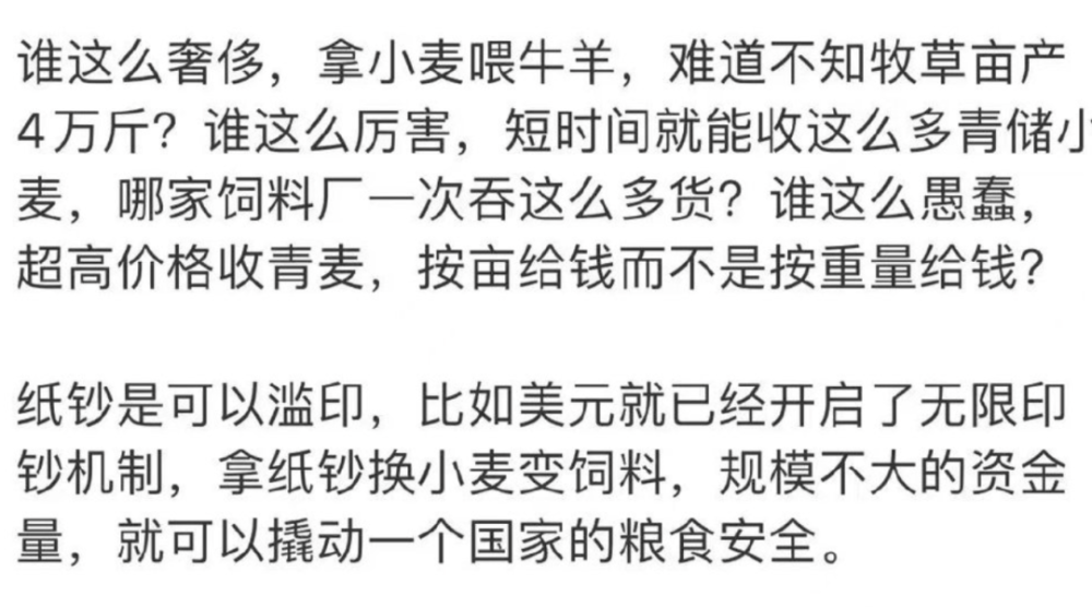 保障粮农:让真正愿意种地的人赚到钱 让种粮的农民有钱可赚,保障农民利益,就是保障农民种粮积极性的根本,也是保障14亿人口粮安全的根本。 “过去这些年中,我们国家出台了那么多政策和措施去保障农民利益,但农民的利益,是不是真的得到了更完善的保障?”中国农业大学教授朱启臻说,“网传的视频,只是极个别的现象,甚至可能是误传或炒作,但为什么会引发那么多的讨论和争议,我们都相信,评论中那些要效仿的说法有些过激,只是情绪化的表达,不会真把没成熟的小麦当成青贮饲料去卖。但他们为什么会这么说?这是值得思考的。” 网上的争议,是否会影响种粮者的积极性?又如何解决情绪背后的问题?朱启臻说,“不管是真卖还是情绪化表达,都不应该去责怪农民。出现这样的现象,应该引起整个社会的重视和反思,不管是通过市场调节的方式,还是通过宏观调控的方式,要怎样做才能真正让种粮食的人有钱赚?同时也要考虑,怎样才能让真正的农民去种田。” 随着农业现代化的推进,农业的集约化、规模化也在不断提升,近些年来,我国着力推动家庭农场、合作社等新型经营主体。但在现实中,一些地方的农业集约化,并非以农民为主体,“有的地方政府贪大求全,盲目引入工商资本,把土地集中起来,流转给工商资本。资本是逐利的,如果地荒着就能赚钱,资本肯定会这么干。但农民不会,真正的农民,哪怕赔钱也要种,今年赔钱,明年还是会种。当然,这并不意味着,农民就应该赔钱种地,而是说,要让那些真正愿意种地的人能种地,让真正种地的人赚到钱。” 新京报记者 周怀宗 编辑 张树婧 校对 柳宝庆