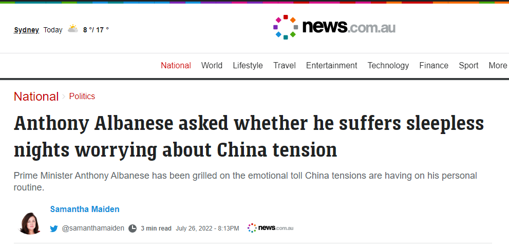 “我希望不会。”当被问及是否想过将来会经历类似处境时,阿尔巴内塞这样说。他随后强调了和平稳定的必要性,并称将“尽所能”避免中澳之间可能发生“军事冲突”。据报道,阿尔巴内塞在回答这一问题时被主持人打断了,后者说,中国如今已经成为每个人谈论的话题,一些知名人士称,中国如今“更加咄咄逼人”。她问道,阿尔巴内塞是否有责任向澳民众阐明“战争风险”。 “我们有责任在不引发对可能不会发生的事情的恐惧的情况下公布相关情况。”阿尔巴内塞说,堪培拉需要对所面临的情况作出清醒的反应。 弗格森依旧并未放弃谈论中国。据澳大利亚新闻网报道,她接着问,澳将如何应对来自美国的“不可避免”的压力,即可能要派遣军队“保卫”台湾。 阿尔巴内塞则说不会对此问题“做任何假设”,他还表示“澳大利亚人非常清楚(可能的)风险,重要的是我们要列出在国家安全领域面临的挑战,但同样重要的是,我们不能为了在国内政治上加分而引发恐惧。” 阿尔巴内塞今年5月就任澳总理以后,中澳关系的发展走向一直备受关注。中国外交部发言人7月25日表示,一个健康稳定的中澳关系符合两国人民根本利益和共同愿望。中方对于同包括澳大利亚在内的各国开展务实合作的立场是一贯的。“我们希望澳方抓住两国关系出现机遇的契机,付诸实际行动,重塑对华认知,本着相互尊重、互利共赢的原则处理中澳经贸关系。澳方应同中方相向而行,为改善中澳关系减少负资产,积累正能量。”