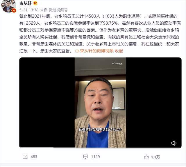 [时事新闻] 老乡鸡1.6万员工未缴社保?老板道歉:参保率超93%,感到羞愧 |