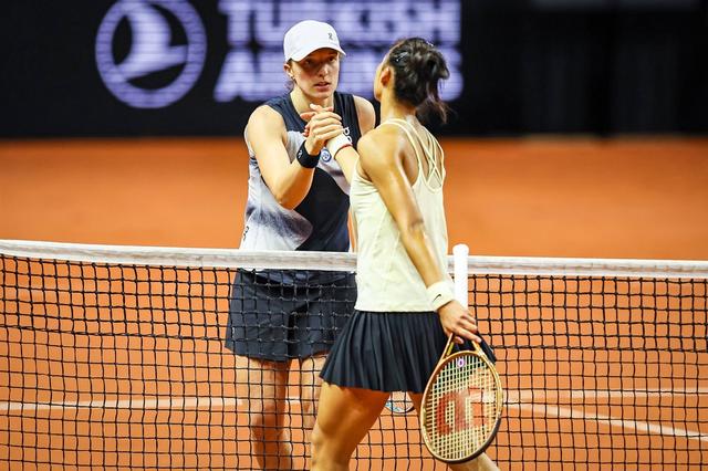 失误过多,状态来得太晚 作为上赛季的WTA年度最佳新人得主,郑钦文的身上从不缺乏冲劲,即便要面对的是当下的世界第一,她也一直保持着自信。 此前在斯图加特首轮,郑钦文以两个6-4击败美国选手帕克斯过关,在展望即将到来的和斯瓦泰克的对决时,她表示自己会全力以赴。 “第一次和她交手的时候,她是世界第一,而我只是一个无名小将,那是我第一次体验到那样的比赛气氛,不过现在我有了更多的经验。” “我希望能展现出自己最好的网球水平,斯瓦泰克是目前全世界最棒的选手。对我来说这肯定非常困难,但我喜欢挑战,我会像一直以来那样竭尽全力。” 但或许是对于胜利太过于渴望,第三次与斯瓦泰克隔网相对的郑钦文,并未能打出让自己满意的表现——不够耐心的线路选择和过多的失误,让她很快就以1-6输掉了第一盘。 第二盘,郑钦文又是率先遭遇破发,直到第八局,她才终于逐渐找到手感,逼出破发点并成功兑现,将比分追到了4-4。 然而在随后第九局的鏖战中,斯瓦泰克还是关键分把握更胜一筹,再度实现破发,最终以6-4拿下第二盘,赢下比赛。 数据统计显示,郑钦文全场打出10个制胜分,高于对手的5个,但同时也有多达37次非受迫性失误,是对手的两倍(19个)。 值得注意的是,其中有23个非受迫性失误是来自反手击球,只有3个来自正手,余下11个则是来自接发。