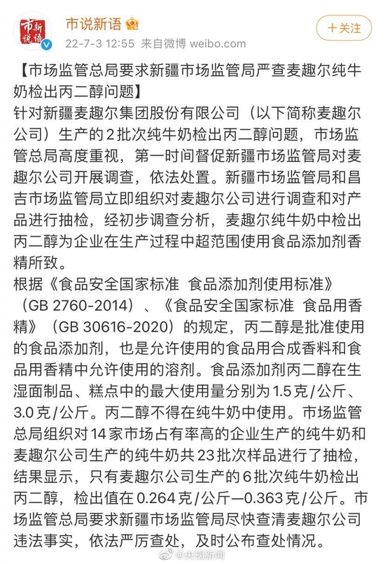 这个品牌成立于1988年,由烘焙西点起家,后来加入了牛奶业务线,成为新疆当地的牛奶品牌之一,并受到了部分当地人的欢迎。“我一个新疆人,从小喝到大,几十年的本地老品牌,出了这样的丑闻,真是自己作。” 搭上新媒体的快车之后,引来的销量激增与麦趣尔奶源不足之间却形成越来越倒挂的状态,奶源自给率却没跟上,而奶源是决定乳制品质量的根本因素。 6月24日,麦趣尔参与2022年新疆辖区投资者网上集体接待日暨上市公司业绩说明会。会上有投资者提问,公司奶源自给率现在多少。对此麦趣尔董事会秘书姚雪回复表示,由于本公司奶牛养殖尚处于初级阶段,牛群结构也在逐步调整过程中,因此奶源自给率还比较低。 财报显示,2021年麦趣尔直接采购了4.17亿元的原奶,向合作社或农户采购原材料占采购总金额比例超过30%。 在此期间,新兴的国产牛奶品牌,不管是认养一头牛还是其他品牌,都主打自建牧场,严格控制奶源质量,逐渐像现代化乳制品生产技术靠拢。 相比之下,2014年,麦趣尔发行3.3亿定增,打算建造日处理300吨生鲜乳产线,2000头奶牛养殖基地等,但进展缓慢,原本4年建成的自有牧场,麦趣尔拖了9年才开始投产,可谓“起了大早、赶了晚集”。 从社交媒体的反馈来看,麦趣尔丙二醇事件,并未大面积波及新疆奶的声誉。但这也给急速扩张中的新消费品牌们敲响了警钟。