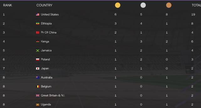 北京时间7月21日,俄勒冈田径世锦赛第6比赛日战罢。在这个比赛日总共产生了2枚金牌,分别是女子铁饼和女子3000米障碍项目。中国代表团在这个比赛日再添1金,在金牌榜上升到了第3位。 在女子铁饼项目决赛的比赛当中,中国队选手冯彬表现出色,她凭借着第1投扔出的69米12的成绩,刷新了个人生涯新高,成功摘下了金牌。克罗地亚名将佩尔科维奇以68米45的成绩获得银牌,铜牌被美国名将阿尔曼获得,成绩是68米30。 女子3000米障碍决赛,代表哈萨克斯坦出战的杰鲁托以8分53秒02的成绩打破世锦赛纪录夺冠,埃塞尔比亚选手格塔丘8分54秒61的成绩获得银牌,这一成绩也刷新了她的新高,铜牌得主是另一位埃塞俄比亚选手阿贝贝,成绩是8分56秒08。 此外在这个比赛日还进行了女子标枪项目的预赛,两位中国选手吕会会和刘诗颖出战比赛。奥运冠军刘诗颖第一投就取得了63米86的成绩,超过达标线成功入围决赛。亚洲纪录保持者吕会会57米59的成绩刷新赛季最佳,不过遗憾未能进入决赛的争夺。 在金牌榜方面,美国队6金5银8铜仍旧领跑,埃塞俄比亚3金4银1铜排名第2位,中国队2金1银1铜上升到第3位,排在第4到第8位的分别是肯尼亚、牙买加、波兰、日本、澳大利亚、比利时、英国和乌干达。