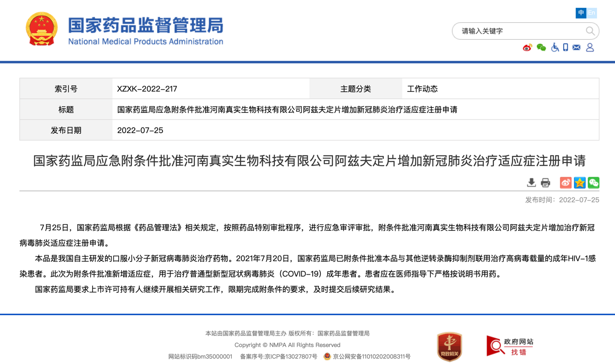 辉瑞早些时候表示,计划在今年提供1.2亿个疗程的Paxlovid。今年以来,辉瑞股价已累计下跌超过12%。辉瑞即将于7月28日公布最新一个季度的财报。 根据Airfinity的预测,另一家提供新冠口服药的企业默沙东今年的供应预计仅为1500万个疗程。 从整体销售来看,Airfinity预计,今年辉瑞Paxlovid的总销售额将达到232亿美元的,低于过去三个月预测的236亿美元;默沙东的口服药总销售额估计为58亿美元,低于此前估计的64亿美元;日本制药公司盐野义被推迟批准的新冠口服药的销售额估计为5亿美元,低于此前预估的25亿美元。 在国内,除了真实生物的阿兹夫定片,还有君实生物的新冠口服药VV116片也已进入临床III期阶段。今年5月23日,君实生物公告称,VV116片在一项对比辉瑞PAXLOVID用于轻中度新冠病毒肺炎早期治疗的III期注册临床研究达到方案预设的主要终点,并表示将于近期递交上市申请。