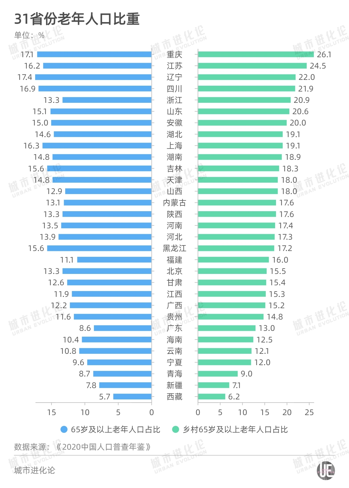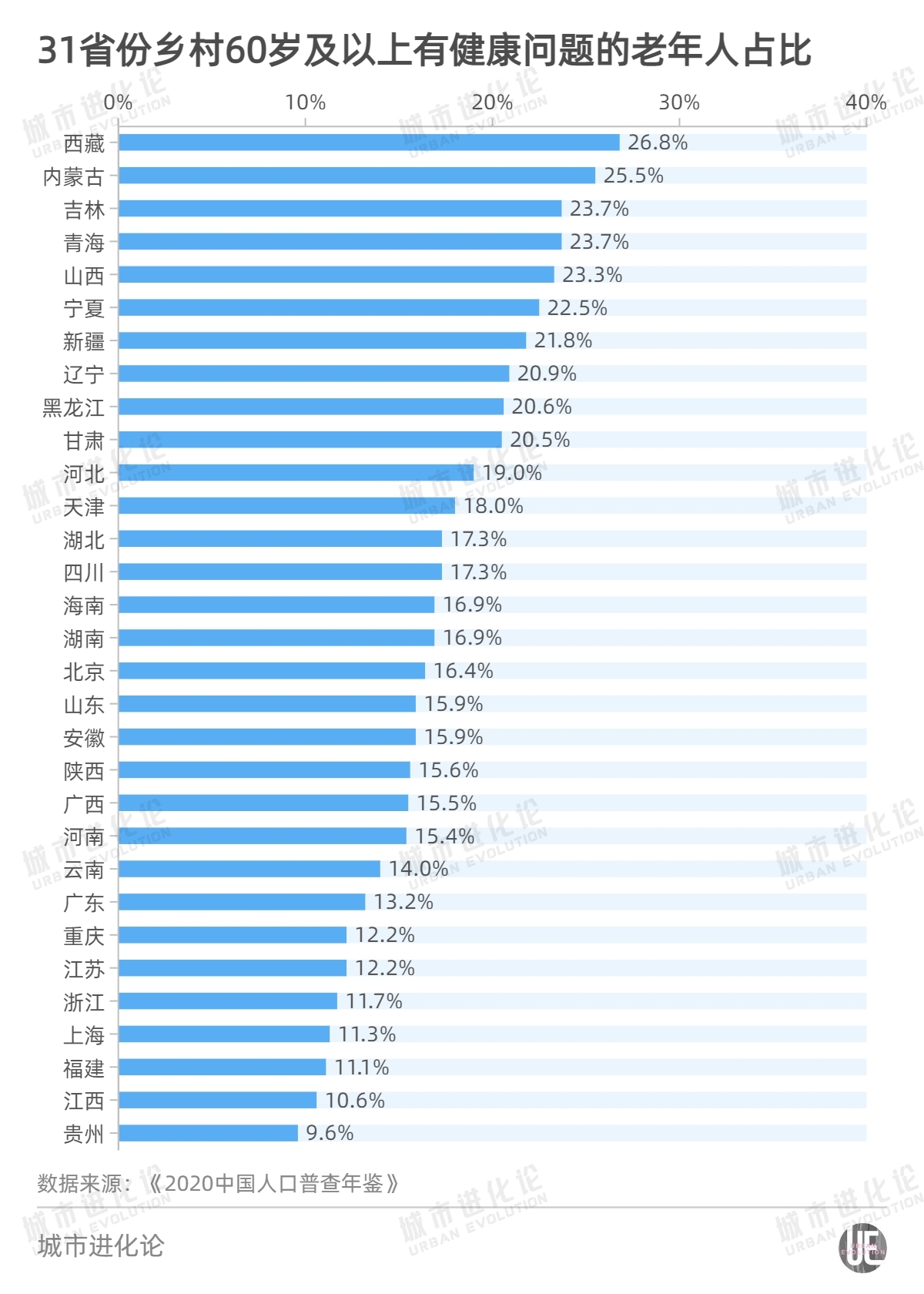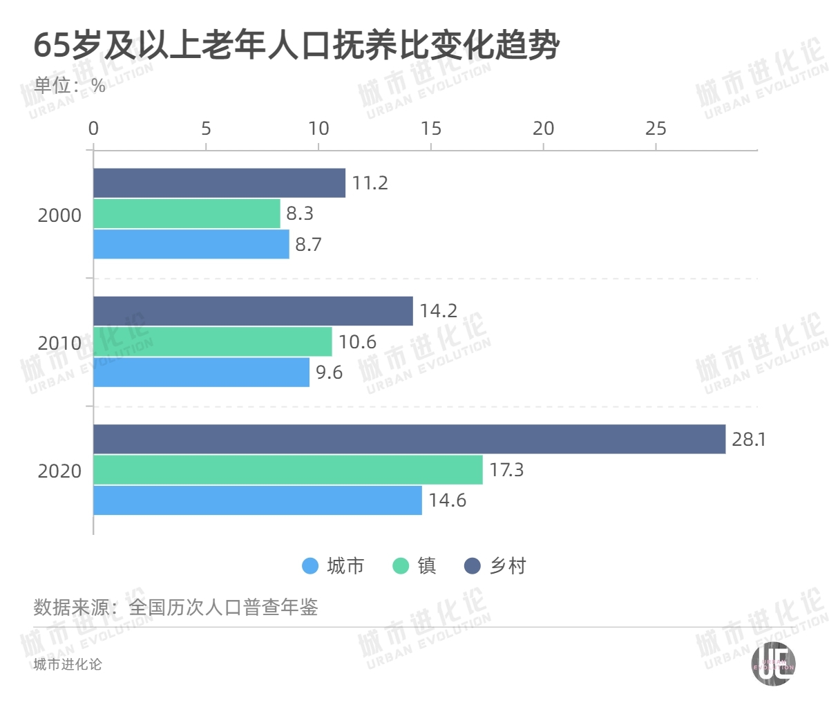 近日,B站《回村三天,二舅治好了我的精神内耗》视频火遍全网。其中有一幕格外令人动容: 88岁高龄的“姥姥”,生活无法自理,多次希望一死了之。66岁的“二舅”身患残疾,仍在为了生计奔波,却毅然扛起照顾姥姥的职责。每当他出门,便将姥姥安置在他常常骑的那辆农用电三轮车斗里,他到哪儿,她就到哪儿。视频中说道,“66岁老汉‘随身携带’88岁老母,这个6688组合简直是‘酷’得要死。” 我们暂时无从知晓视频真实性到底有多高,但在不少人看来,“二舅”走红,恰因为他是中国万千农村的缩影。视频下方的评论中,挤满了年轻人对仍在农村生活的家人的思念,他们与“二舅”共享类似的时代记忆,也曾经或正在经历乡村的老年生活。 根据不久前公布的《2020中国人口普查年鉴》数据,全国农村60岁及以上老年人口已超过1.2亿人,与2010年相比增长约22.2%。 当“二舅”令大众看见这个沉默而庞大的群体,我们看到的是一个愈加“苍老”的乡村形象。农村老年人的生存和养老问题,值得更多人予以关注。 农村老年人口规模经历了迅速扩大的过程。 在过去三次全国人口普查中,随着老年人口快速增长,农村60岁及以上老年人口规模从2000年8556.8万人迅速增长至1.21亿人,20年扩大一半左右。