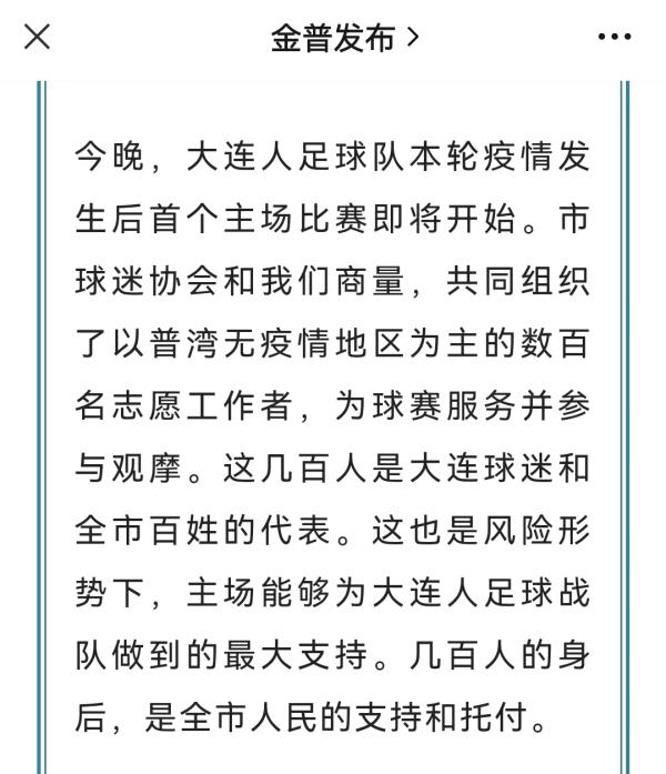 大连金州新区官方平台“金普发布”对此写道,“大连人足球队本轮疫情发生后首个主场比赛即将开始,市球迷协会和我们商量,共同组织了以普湾无疫情地区为主的数百名志愿工作者,为球赛服务并参与观摩。”
