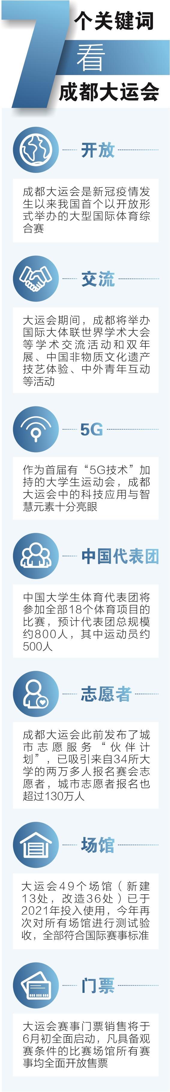 体育盛会 以开放形式举办 有“5G”加持 成都大运会是新冠疫情发生以来我国首个以开放形式举办的大型国际体育综合赛。王嘉毅说:“这是一次来之不易的大运会,经历了两次延期,但我们始终全力做好筹备工作。这是一次意义重大的大运会,必将为共创世界美好未来作出贡献。这是一次注定精彩的大运会,经过4年筹备,成都建设了品质卓越的场馆设施,培养了严谨专业的办赛队伍,策划了丰富多彩的教育文化交流活动。” “竞赛组织是成功办赛的关键。”国家体育总局副局长周进强在发布会上表示,“阶段性任务已经完成,进展顺利。”据他介绍,成都大运会参赛团体的规模报名正在顺利进行中。教育部和体育总局已共同选派出1077名国内技术官员,他们将与国际技术官员共同完成竞赛执裁、组织管理等工作。此外,赛时指挥调度中心已于3月3日开始试运行,今年6月上旬将开展全流程、全要素演练,继续优化赛时组织运行和服务保障水平。 兴奋剂检查方面,目前已完成对成都大运会兴奋剂检查站的三轮验收,均满足要求。在兴奋剂检查上遵循节俭办赛原则,将使用中国兴奋剂智慧管理平台开展无纸化检查,将首次在大运会上开展干血点的检查,通过最新的科技手段和严格程序控制,为运动员营造公平干净的竞赛环境。 在场馆方面,四川省副省长郑备表示:“大运会49个场馆(新建13处,改造36处)已于2021年投入使用,今年我们再次对所有场馆进行测试验收,全部符合国际赛事标准。接下来的5月、6月,还将举办系列测试赛,进一步优化提升场馆功能。” 此外,作为首届有“5G技术”加持的大学生运动会,成都大运会中的科技应用与智慧元素十分亮眼。据成都市市长王凤朝介绍,东安湖体育公园的“三馆”在修建全过程中均采用“BIM技术+智慧工地”驾驶舱系统,实现大型场馆的智慧建造;“冰球场”可在4至6小时内转换为“篮球场”,实现场馆的多功能赛事用途;凤凰山体育公园配备了智能导航系统和场馆智能安全援助服务系统,具备场馆室内定位导航、实时定位引导导航与一键救援服务功能;被称为特殊“服务生”的“蓉宝”机器人,则是世界上首款带有应急功能的机器人,内部包含急救包、心脏除颤器等医疗应急工具,可提供人脸识别、测温、多语言翻译等服务;专门开发的“大运通”APP,将提供参赛、观赛、生活三大服务功能。 据了解,中国大学生体育代表团将参加全部18个体育项目的比赛,预计代表团总规模约800人,其中运动员约500人。