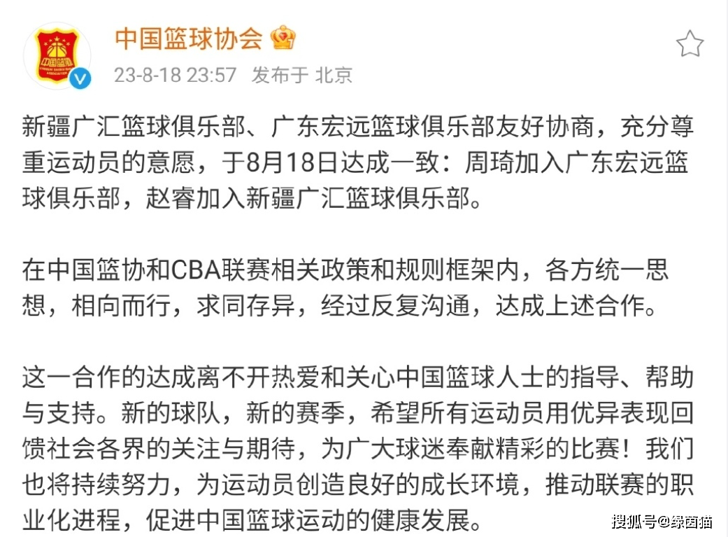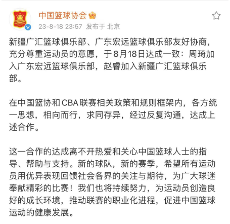[时事新闻] 中国篮协官方:周琦加盟广东队 赵睿加盟新疆队 |