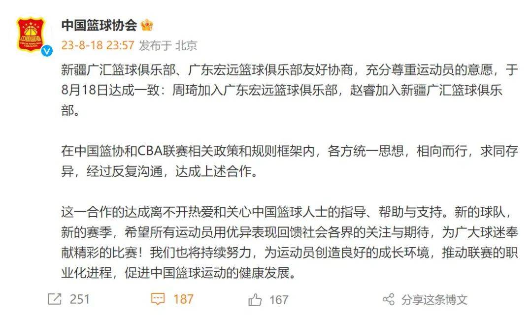 [时事新闻] 中国篮协官方:周琦加盟广东队 赵睿加盟新疆队 |