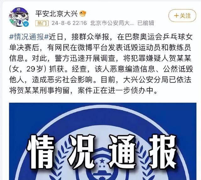 [时事新闻] 警方深夜通报!贺某某(女,29岁)因诋毁陈梦、马琳被刑拘,账号曝光 |