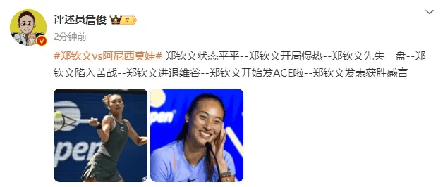 北京时间8月27日凌晨,在2024美网女单首轮,中国“金花”郑钦文以2比1击败阿尼西莫娃。赛后,郑钦文表示,阿尼西莫娃真的很难对付,硬地也是对方最擅长的场地之一,“最后赢下这场比赛意味着我的心态更成熟了一些。” 回顾这场比赛,开场阶段,阿尼西莫娃是发挥更好的一方,进攻打得非常凶狠。首盘一度5比1领先。好在郑钦文及时调整,通过高质量的发球重新获得主动权,并最终赢下比赛。 郑钦文说,阿尼西莫娃实力很强,比赛打得很艰难,能够找到方法通过考验非常高兴,“我了解自己,通常在取得很好的成绩之后会有一点飘飘然,直到再被现实打击,我才会保持谦逊,努力工作。所以这一次当我获得成功时(拿到奥运会金牌),我告诉自己,要吸取澳网的教训,要保持稳定的心态。赢下这场比赛意味着我在心态上有进步,更成熟了。” 下一轮,郑钦文的对手是安德列娃,后者世界排名第75位。如能再进一步,郑钦文可能面对32号种子雅斯特雷姆斯卡。 郑钦文表示,展望接下来的比赛,目标是努力打好每一场比赛,“我认为如果我想在美网取得更好的成绩,就要在硬地场上找到我自己的节奏,或许尝试打得更有侵略性一些。其实首轮比赛我也想要打出攻击性,但我觉得今天如果这样做,我可能会出现更多的失误,所以我还是想保持冷静,尽量多打一拍。” 来源:北京日报