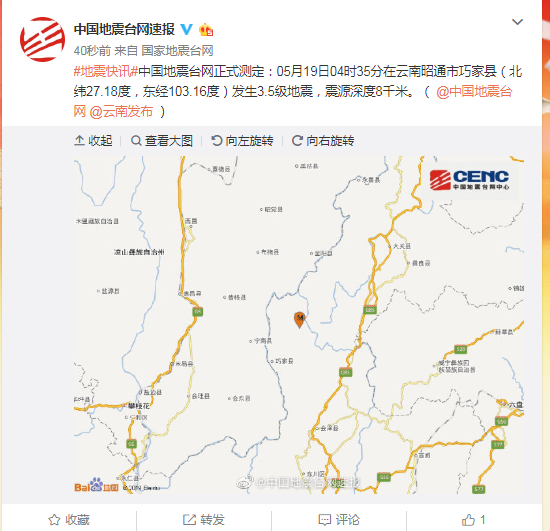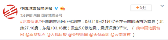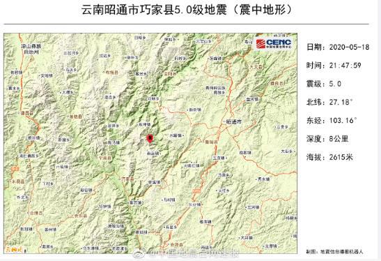 这是5月18日21时47分,云南昭通市巧家县发生5.0级地震,震源深度8千米,导致巧家、鲁甸两县4人死亡,25人受伤。有2人是被落石砸中,2人是被垮塌的房屋埋压,最终死亡。