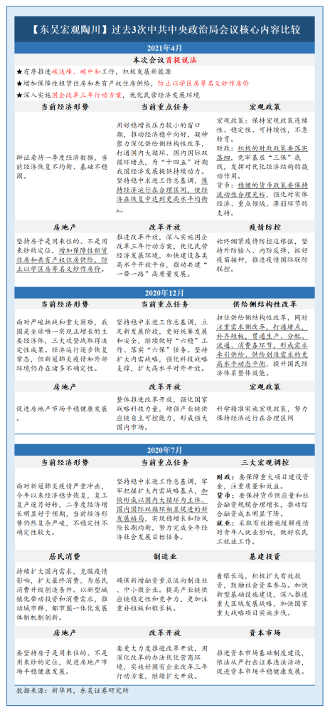 重磅会议如期召开。 据新华社报道,4月30日,中共中央政治局召开会议,分析研究当前经济形势和经济工作;听取第三次全国国土调查主要情况汇报;审议《中国共产党组织工作条例》。中共中央总书记习近平主持会议。 本次政治局会议信息量不少,关于碳达峰、碳中和、货币政策等,都有提到以及定调,还包括首次点名学区房炒作,但预期中的六保、六稳、大宗商品价格和人口问题此次会议均未提及,具体来看: 一是,定调一季度经济:我国经济恢复取得明显成效,经济运行开局良好,高质量发展取得新成效。表明经济形势不错,但恢复不均衡、基础不稳固。目前处于稳增长压力较小的窗口期。 二是,坚持稳中求进仍是工作总基调,但提出了三新概念,即准确把握新发展阶段,全面贯彻新发展理念,加快构建新发展格局。 三是,财政政策和货币政策表述变化不大,财政方面提到兜牢基层“三保”底线(保基本民生、保工资、保运转)。另外,此前关于六保的表述未再提及。保持流动性合理充裕,意味着资本市场仍不会有太大变数。 四是,提到一个产业,即工业互联网,加快产业数字化。这个产业规模巨大。据中国信息通信研究院发布的《工业互联网产业经济发展报告(2020 年)》数据分析,2020年,工业互联网产业经济总体规模约为3.1万亿元,工业互联网核心产业约为6520亿元,工业互联网融合带动的经济影响约为2.49万亿元。 五是,两提民营经济!首先促进制造业投资和民间投资尽快恢复;其次优化民营经济发展环境,加快建设各类高水平开放平台,推动共建“一带一路”高质量发展。 六是,首提学区房炒作。要坚持房子是用来住的、不是用来炒的定位,增加保障性租赁住房和共有产权住房供给,防止以学区房等名义炒作房价。