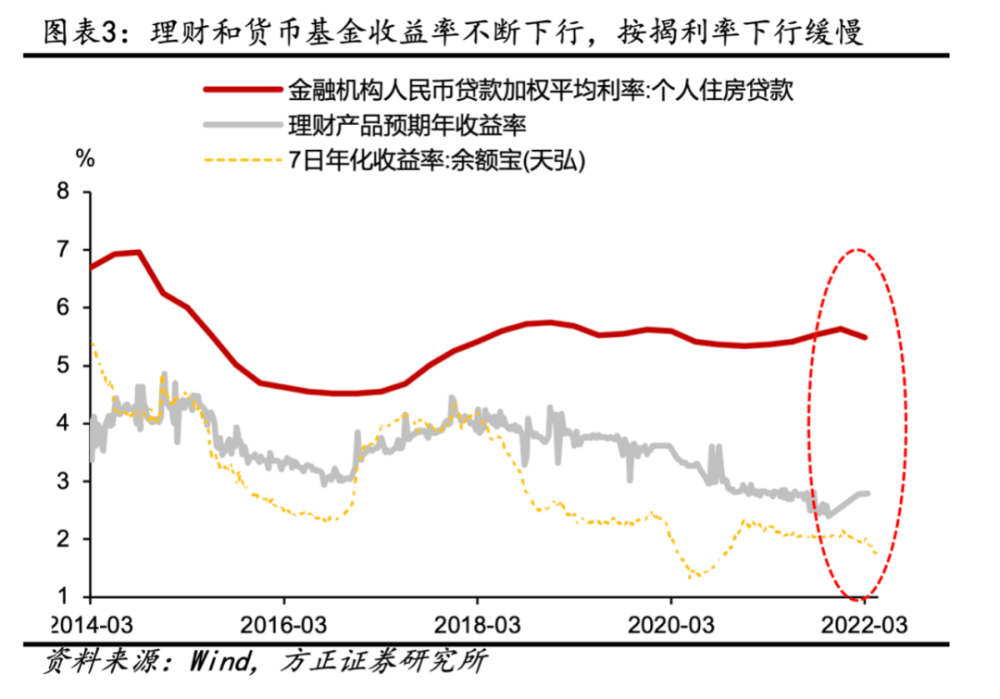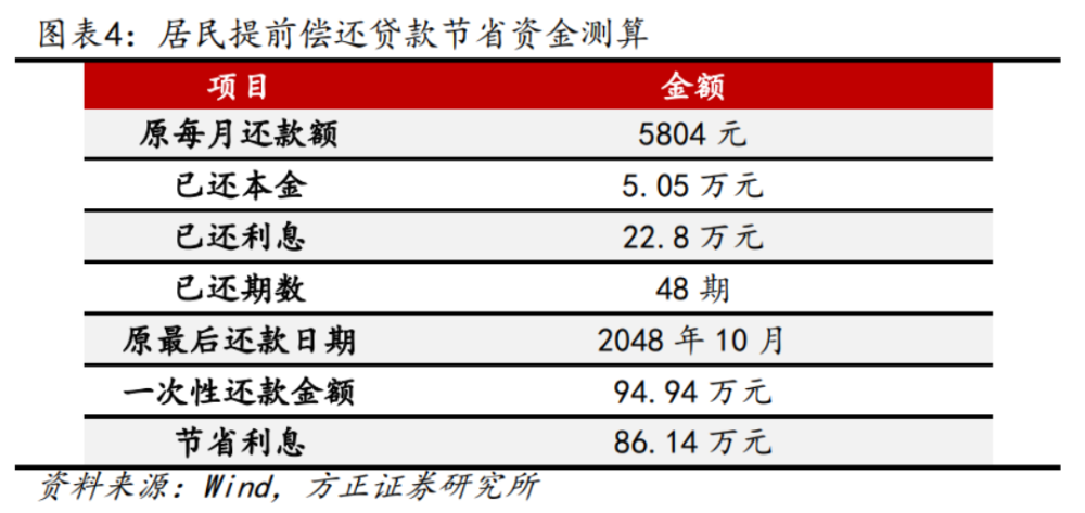 居民面临两种选择,方案一:将现金用于一次性还清房贷;方案二:购买理财产品,那么哪种选择能带来个人效益最大化。 方案一:还房贷。通过房贷计算器算得最后一次性还款(剩余26年)94.94万元,节省86.14万元的利息。平均每年节约利息3.31万。 方案二:购买理财。以94.94万元用于理财(3%~4%),一年的收益能达为2.85~3.8万元。 我们发现当理财收益率为3.5%时,这与5.7%的房贷利率提前还款节省的收益基本打平。虽然二者读数上的利差相差较大。造成这种与常识有差的结果主要原因房贷利率的计息方式与理财收益率有差别。 房贷利率=[贷款本金×月利率×(1+月利率)^还款月数]÷[(1+月利率)^还款月数-1]; 理财收益率=[(终止净值-起始净值) ÷起始净值 ] ÷(终止日期-起始日期) ×365×100% 可以看到理财收益率是简单的单利逻辑,与本金及买入时点无关,但房贷利率还与还款月数有关。 我们选取的2018年10月的房贷利率是2016年新一轮房地产上行周期中的绝对高点,此场景下对比3.5%以上的理财收益率来说,提前还款是不划算的,在其他时点更难保证提前还款是划算的。 仅从结果来看,只考虑理财收益率与房贷利率价差扩大就提前还款并不是一笔划算的买卖。诚然,单一案例并不具备广泛的代表性,但值得注意的是除了房贷利率与理财收益率外,还需要从还款时间年限、还款方式、已还款期数等多要素共同评估。也可能当前出现提前还贷的情况说明居民对于远期是否能保证每年3%~4%的理财收益存疑。