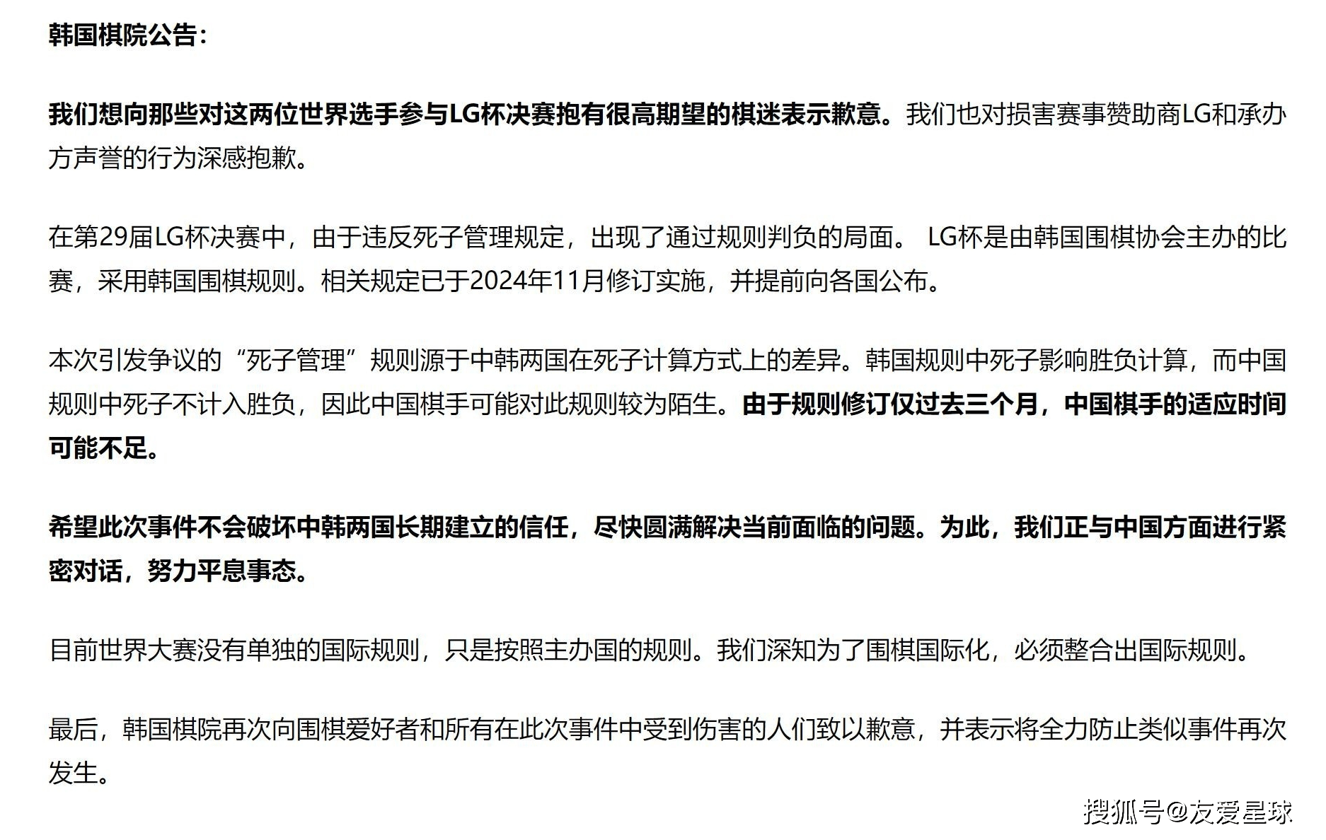 新华社首尔1月28日电(记者陆爱华 朴晋泽)针对有关“死子”管理规定引发第29届LG杯世界围棋棋王战决赛的争议,韩国棋院28日通过官网发布声明,解释了规则问题并就相关争议致歉,表示将尽快与中国和日本棋院讨论,制定符合世界大赛的统一规则。 声明说,在LG杯决赛中,首次发生了因违反“死子”管理规定而决定冠军的事件。LG杯是韩国棋院主办的大赛,适用于韩国围棋规定。相关规定于2024年11月修订施行,事前已向所有外国团体公布。“死子”管理规定源于两国不同的计算方法。在“死子”对计算胜负产生影响的韩国围棋界,这是必要规定,但对于中国围棋界是比较陌生的规定,中国选手的适应时间不足。希望韩国和中国相关方不会因为此次事件失去此前积累的信任。 韩国棋院表示,正在与中方进行紧密对话,并承诺将制定对策,争取圆满解决面临的问题。最后,韩国棋院向围棋粉丝们和因此次事件受到伤害的所有人致歉,表示将竭尽全力防止类似事件再次发生。 中国棋手柯洁在23日的第29届LG杯世界围棋棋王战决赛决胜局中,继22日的第二局比赛被判负后,再因未将提子放进棋盒盖遭韩方判定违规,且裁判中断比赛时机具有争议,柯洁不接受判罚结果,选择放弃比赛,韩方宣布韩国棋手卞相壹获得冠军。