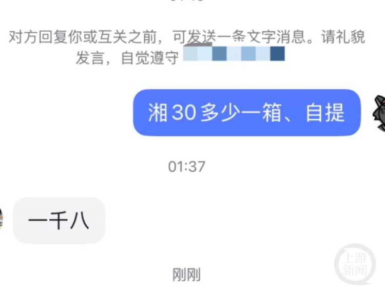 在该短视频平台和小红书平台,记者以“湘30”为关键词搜索发现,类似视频不少。评论区里有网友质疑:“安全吗?”也有网友晒图,自己询问价格卖家回复称:“一箱1800元。自提。”