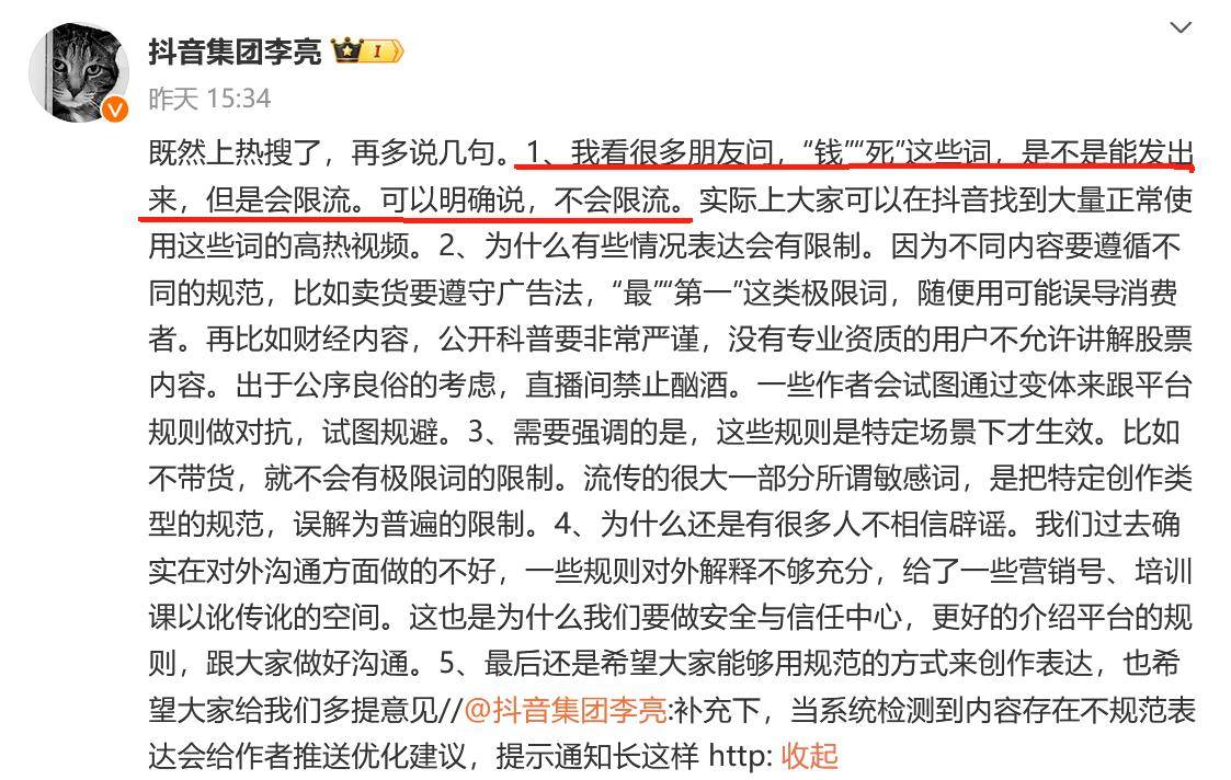 毕竟谁看直播谁知道,更何况群众还有不少是干直播的。 小雷在这方面也问了做直播的朋友们,限流这东西还真存在的。不过涉及的范围很广,比如账号昵称、ID、头像、个性签名、背景图这些使用违规的话,也容易中招。 再有一个就是发布的内容质量低,账号频繁登录、更换设备; 如果没有带货的情况下,你说其他产品比较详细的话,会涉及广告营销被限流。 以及我们常见的直播违禁词,大量私信用户、大量连赞视频、转发等,都是有可能被系统识别,从而导致限流的。 至于娱乐主播方面,限制的自然是说的话和做的动作比较多了。你看像一些炒作、博眼球、恶意瞎搞的直播,别说抖音的工作人员了,放我们用户面前都觉得辣眼。 所以为了维持我们用户的使用度,抖音方面也在慢慢完善,推出各种新制度。 图源:网络 属实也是这两年塌房的网红太多了,真数都数不过来的,从头部主播到小有名气的网红,统统翻车翻了个遍。 要么是虚假宣传,要么就是货不对板,还有各种炫富、卖惨,能闯的赛道统统都安排上了。收割到流量之后,就开始走上直播带货的路,这产品还没把控呢,就轻易开播,你说人家不封你封谁。 而且现在平台对直播管理这方面还是挺严格的,该封就封,该处理就处理。 图源:网络 对于一些想要赚快钱的主播们来说,奉劝还是老老实实做好本分才是长久发展下去的办法。 毕竟从几块钱到十几块钱,再到几百块钱、甚至上千上万的产品,都是有市场和用户需求的。 如果把销售额放在第一位,不注重产品和售后方面的话,那迟早容易凉。 不知道你们有没有用抖音这个软件呢?觉得好使不?评论区唠唠~