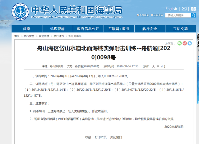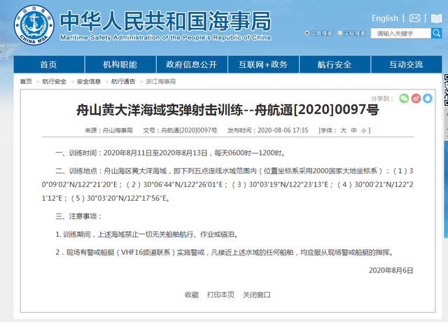 8月6日,中国海事局网站发布了航行通告。通告称,8月11日至13日,舟山黄大洋海域实弹射击训练;8月16日至17日,舟山海区岱山水道北面海域实弹射击训练。 训练期间 上述海域 禁止一切无关船舶航行、作业或锚泊! 舟山黄大洋海域实弹射击训练 舟航通【2020】0097号 一、训练时间:2020年8月11日至2020年8月13日,每天06:00时—12:00时。 二、训练地点:舟山海区黄大洋海域,即下列五点连线水域范围内(位置坐标系采用2000国家大地坐标系): (1)30°09′02″N/122°21′20″E; (2)30°06′44″N/122°26′01″E; (3)30°03′19″N/122°23′13″E; (4)30°00′21″N/122°21′12″E; (5)30°03′20″N/122°17′56″E。 三、注意事项: 1. 训练期间,上述海域禁止一切无关船舶航行、作业或锚泊。 2.现场有警戒船艇(VHF16频道联系)实施警戒,凡接近上述水域的任何船舶,均应服从现场警戒船艇的指挥。 舟山海区岱山水道北面海域实弹射击训练 舟航通【2020】0098号 一、训练时间:2020年8月16日至2020年8月17日,每天06:00时—12:00时。 二、训练地点:舟山海区岱山水道北面海域,即下列四点连线水域范围内(位置坐标系采用2000国家大地坐标系): (1)30°19′28″N/122°13′14″E; (2)30°22′36″N/122°17′20″E; (3)30°19′07″N/122°20′22″E; (4)30°18′16″N/122°14′57″E。 三、注意事项: 1. 训练期间,上述海域禁止一切无关船舶航行、作业或锚泊。 2.现场有警戒船艇(VHF16频道联系)实施警戒,凡接近上述水域的任何船舶,均应服从现场警戒船艇的指挥。 来源:中国海事局网站、杭州交通91.8