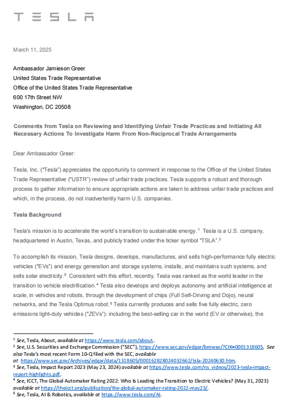 特斯拉在信件中写道:“即使积极推动供应链本地化,某些零部件和组件仍然难以或无法在美国境内采购。 因此,特斯拉支持USTR进一步评估美国国内供应链的限制,以确保美国制造商不会因贸易政策而面临过重负担,例如对关键组件施加成本过高的关税,或对某些战略物资的进口实施不必要的限制。”