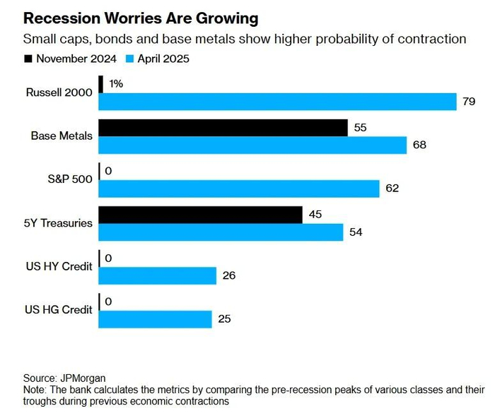 美国最大投行[url=]摩根大通[/url]4月8日表示,以小型股为主的罗素2000指数在近期的大跌中受到重创。该指数目前认为经济衰退的可能性为79%。而在去年11月份,美国大选刚刚尘埃落定之时,这一指数预测的衰退可能性只有1%。