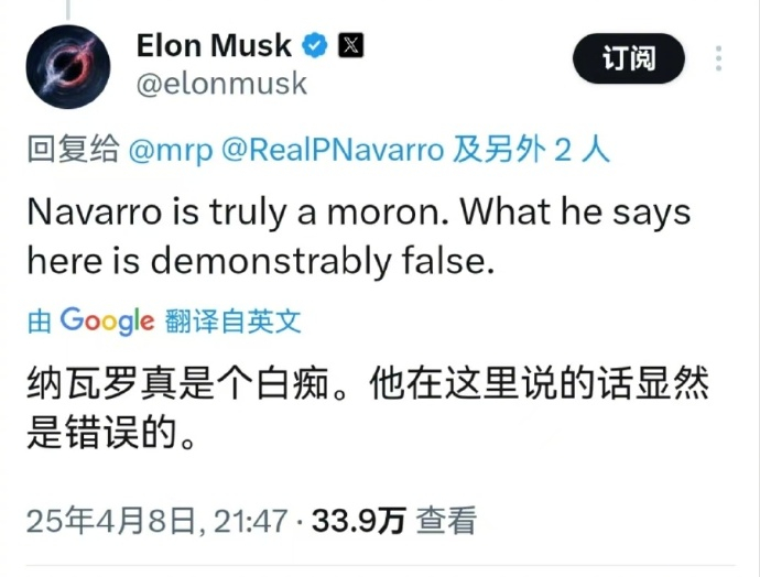 首席贸易顾问被边缘化? 另外值得注意的一点是,最近两天在X上展开骂战的特朗普首席贸易顾问彼得·纳瓦罗(Peter Navarro)和DOGE负责人马斯克,似乎都没有参与特朗普最新的关税决定。 纳瓦罗此前一直是特朗普团队中的强硬派,坚持主张通过关税来减少美国的贸易逆差,此前也一直被认为是影响特朗普关税决策的重要人物之一。而马斯克则是高关税的反对者,此前他也一直与特朗普表现亲密,多次共同出入白宫和海湖庄园。