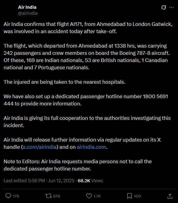 [时事新闻] 多家印媒:一载242人波音787-8“梦想客机”坠毁,起飞几分钟便坠入居民区 |