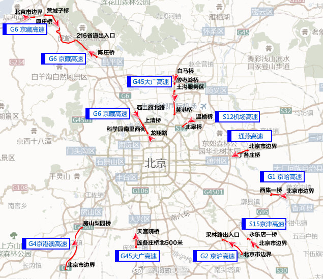 原标题:今日15时北京高速将迎返程高峰 来源:北京青年报 随着国庆假期进入返程阶段,火车站等重点区域客流量逐渐增大。据北京市交通委与高德地图数据预测,今天15时北京高速路将迎来一波返程高峰客流。从具体易堵路段上看,北京市返程易拥堵缓行的高速包括:G6京藏高速、S15京津高速、G2京沪高速的部分路段。