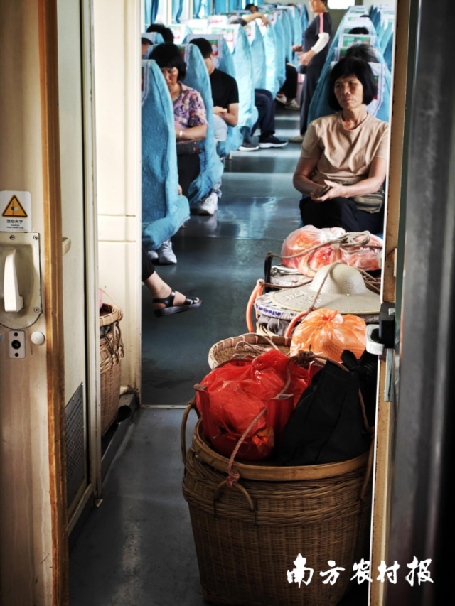 这是当地典型的家庭分工模式,丈夫留守家里负责果树栽种、采摘、联络收购商等事宜,妻子则挑着水果到外地售卖。所以列车里的“担担军”以女性为主。