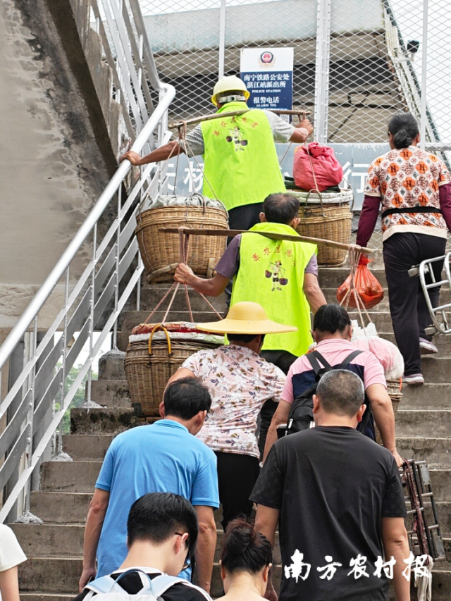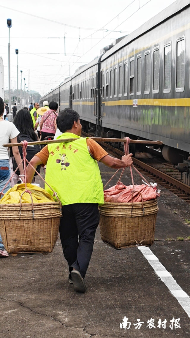 吴乃远身上的绿马甲,由玉林车务段河唇站发放。“这些水果很重,上车需要过人行天桥,河唇站又没有修电梯,所以就给果农的家属发放了马甲,他们帮忙把水果挑上天桥,送上列车。”玉林车务段河唇站长朱元东解释道。但对于这一做法,他也有自己的顾虑。按规定,没有车票的旅客不能进站,“现在没有站台票了,按规定是不允许他们送站的”。近年来,前往广西售卖水果的“担挑客”少了,且人员较为固定,车站的工作人员都十分熟悉,面对果农的实际困难,车站灵活处理,采取了发放绿马甲的方式。“车站还会提前与接车员沟通,确保送站的家属安全出站。”