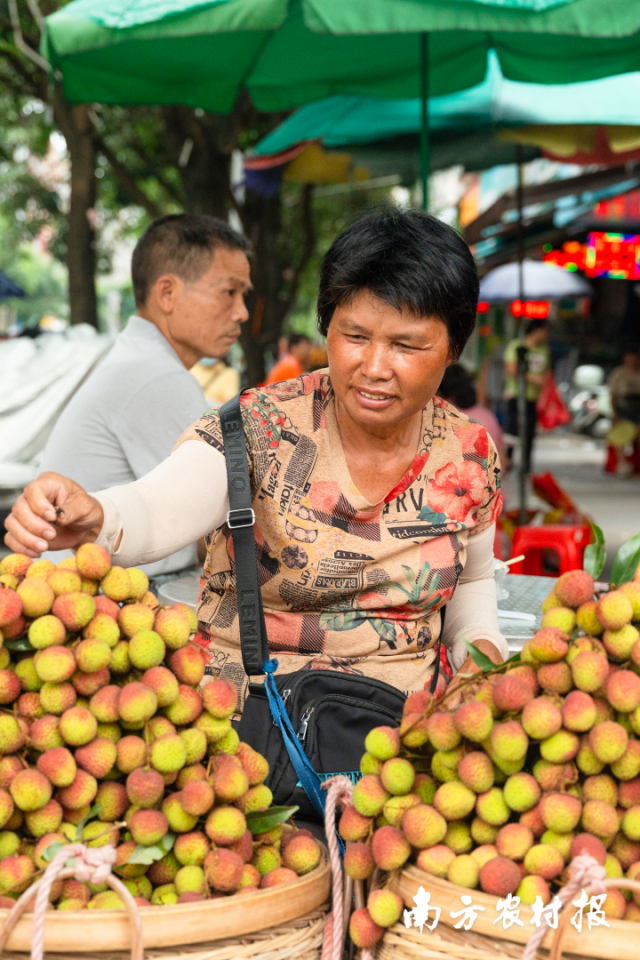今年54岁的罗燕芬只卖果,不种果,每天早上天不亮就要去其他果农家里收水果。“这个时候荔枝好卖。”罗燕芬给南方农村报记者算了笔账,妃子笑荔枝拿货价3.5元/斤,销售价6-7元/斤,来回火车票37元,上午赶时间打“摩的”15元,晚上回去坐公交2元,午饭钱12元。一天的开销控制在70元内,扣除拿货成本,一天能挣200元左右。“365天,我有300天都在广西卖水果。”