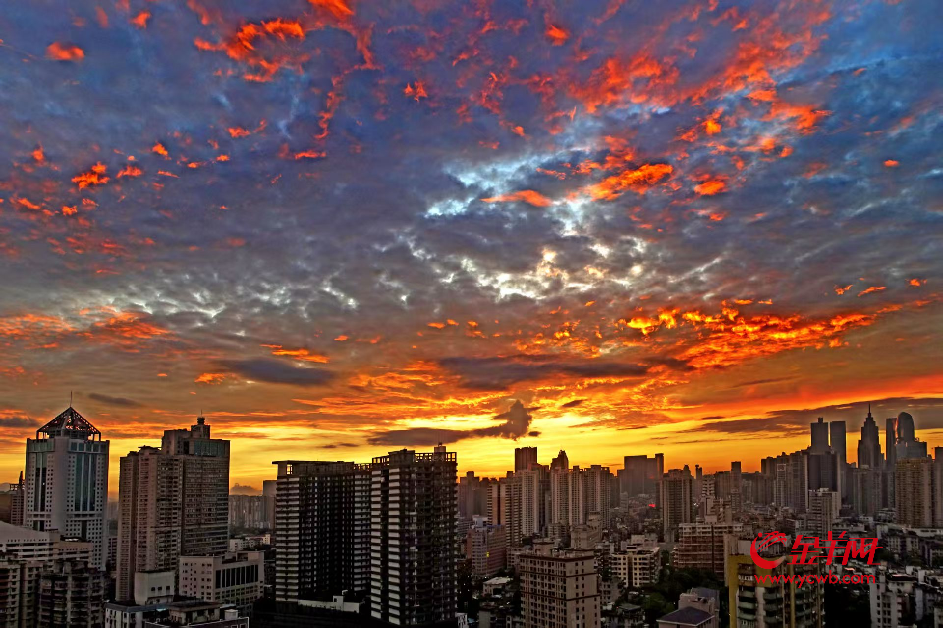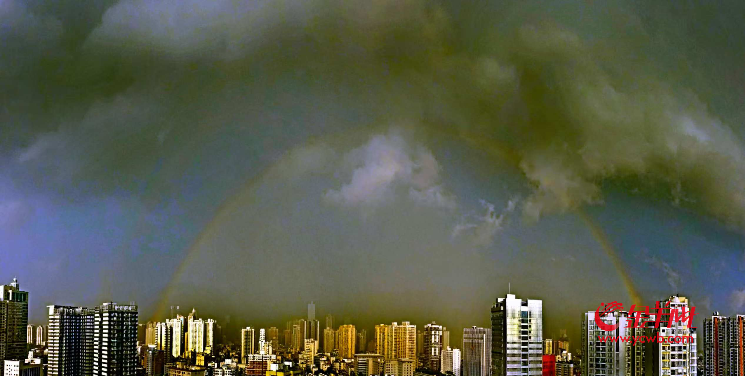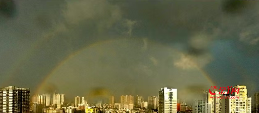 那么,火烧云的成因是什么? 据北京市气象台相关专家此前的分析,火烧云呈现橙红色的原因,依赖于太阳。 太阳的光由多种颜色的光组成的,其光波长各不相同。当它们遇到空气中的障碍物,如气体分子、水滴、尘埃等时,会发生偏转,这种现象称为太阳光散射。较短波长的光(如蓝光和紫光)比较长波长的光(如红光和橙光)更容易被散射。 在晴朗的白天,由于蓝光的散射率更高,我们看到天空会呈现出蓝色;而在日出和日落时,太阳光相比正午穿过大气层的路径更长,这意味着光线需要经过更多的散射,在这个过程中,较短的蓝紫光被散射的更多,而较长的红橙光由于受散射影响较小,会被更多的保留下来,因此日出日落时的天空多呈现出红、橙和黄色。 然而,并非所有观察者都能轻松观赏到这一景致,其所在地和太阳光传输路径上的天气条件起着至关重要的作用——日出日落前后,太阳光传输路径上没有降水、低云等遮挡,光线可以到达观察者所在地;其次,观察者所在地的大气透明度高、能见度好,没有雾或霾;观察者所在地有可以作为“幕布”的云层出现,被红色和橙色为主的太阳光照亮,如此才能看见我们所说的朝霞和晚霞。 而在霞出现之前的降水,不论在能见度还是空气清洁度方面,都为“火烧云”的亮相提供了更完美的舞台,这也是雨后更容易出现超级朝霞或是晚霞的原因。 另外,可能很多市民会有疑问,彩虹挺常见的,不过双彩虹却难得,它的成因又是什么? 据广州市气象台相关人员此前的分析,从学术上讲,“双彩虹”中一条是“虹”(主虹),一条为“霓”(副虹)。“霓”“虹”同时出现的条件是在天空水汽充沛且太阳光入射角分别为42°左右和52°左右,因此大家能欣赏到“双彩虹”的时间常在早晨和傍晚的雨后。 理论上来讲,光线可反射3次、4次形成更多层彩虹,但因光线急剧减弱,肉眼极难观测到。 下次看到双彩虹时,记得观察颜色顺序和亮度差异——这是大自然用阳光和水滴演绎的绝妙光学魔术! 文 | 记者 梁栋贤 图 | 郑讯
