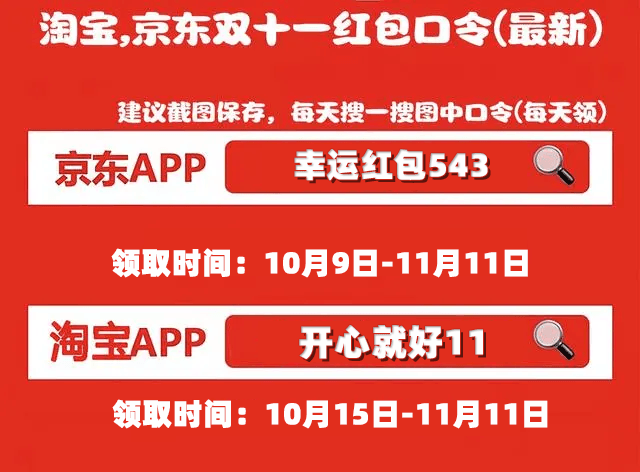 三、天猫/淘宝双11:官方立减为主,红包贯穿全程 天猫活动安排: 预售期预售预热:10月15日 14:00–19:59定金支付:10月15日 20:00 – 10月20日 17:59尾款支付:10月20日 20:00 – 10月24日 23:59 现货期现货预热:10月17日 00:00 – 10月20日 19:59现货售卖:10月20日 20:00 – 11月14日 23:59 淘宝活动安排: 现货期现货预热:10月17日 00:00 – 10月20日 19:59现货售卖:10月20日 20:00 – 11月14日 23:59 核心玩法: 官方立减15%起,无需凑单; 超级红包全程可领(10月15日–11月14日); 88VIP会员可领860元大额券; 超级红包领取方法:打开手机淘宝/天猫App,搜索「开心就好11」即可领取红包,每日3次,最大面额25888 四、京东双11:六阶段推进,精准锁定需求 京东将活动划分为六个清晰阶段,便于消费者分批次选购: 预热期(10月9日 00:00–19:59)红包首发,加购锁库存,建议提前锁定大件商品,享30天价保。 抢先购(10月9日 20:00–10月31日)数码家电直降30%,官方直降+跨店满减上线,适合急需家电、3C等品类的用户。 开门红(10月31日 20:00–11月3日)全品类满减启动,发放“满5000减1000”超级补贴券,为大件采购最佳窗口。 专场期(11月4日–11月7日)每日一大牌主题日,品类专属优惠,适合针对性选购。 高潮期(11月8日–11月11日)11月10日晚8点红包雨翻倍,优惠力度达峰值,适合抢购爆款与高端商品。 返场期(11月12日–11月14日)错峰捡漏,仍享30天价保,适合查漏补缺。 京东红包加码日:10月26日、31日、11月7日、10日晚8点,红包中奖率翻倍。超级红包领取方法:打开手机京东App,搜索「幸运红包543」即可进入红包领取页面,每日均可领取。最大面额11111元