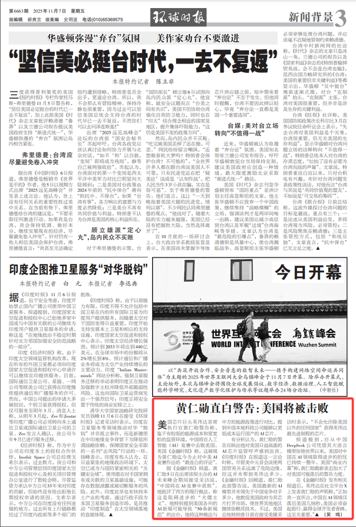 在《金融时报》发布相关报道后,英伟达在社交平台X上发表黄仁勋的声明称,“正如我一直所言,中国在AI领域仅落后美国几纳秒,美国必须奋起前行、赢得全球开发者青睐,这至关重要。”