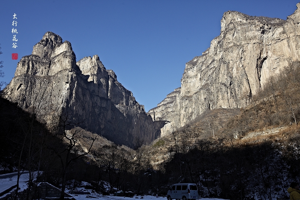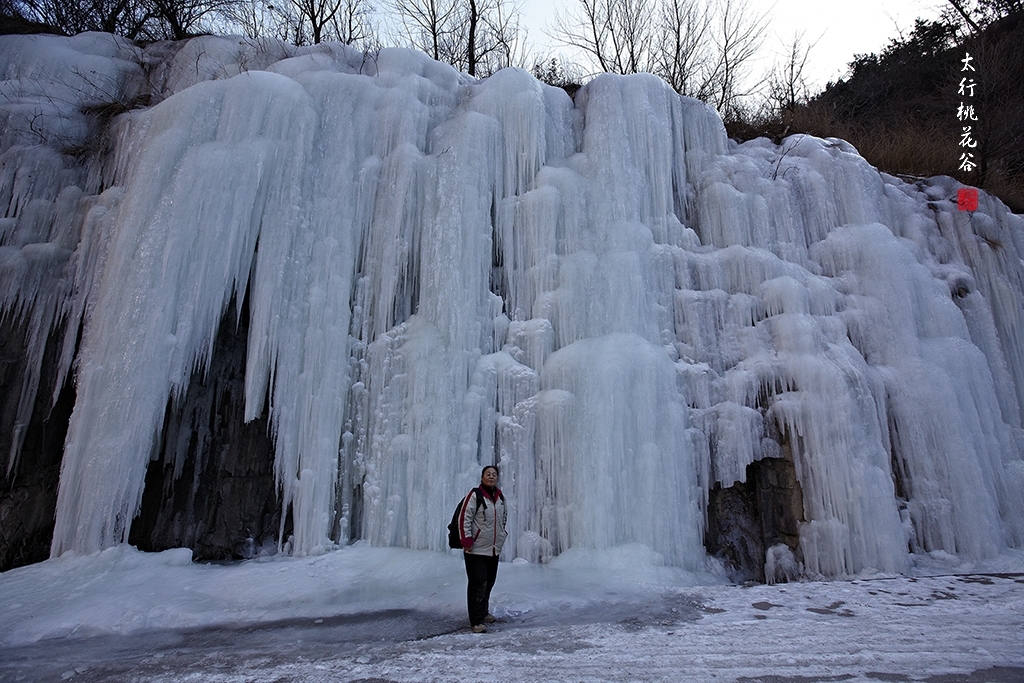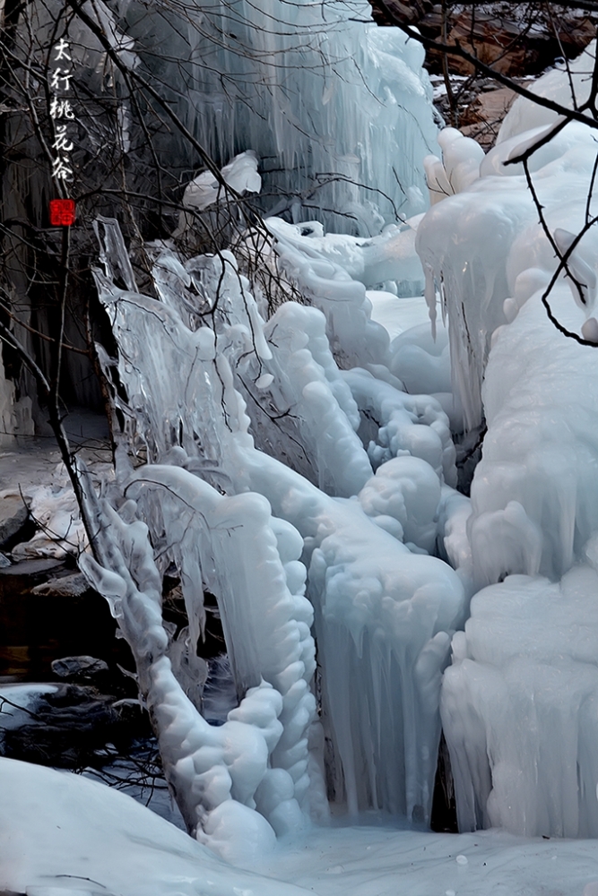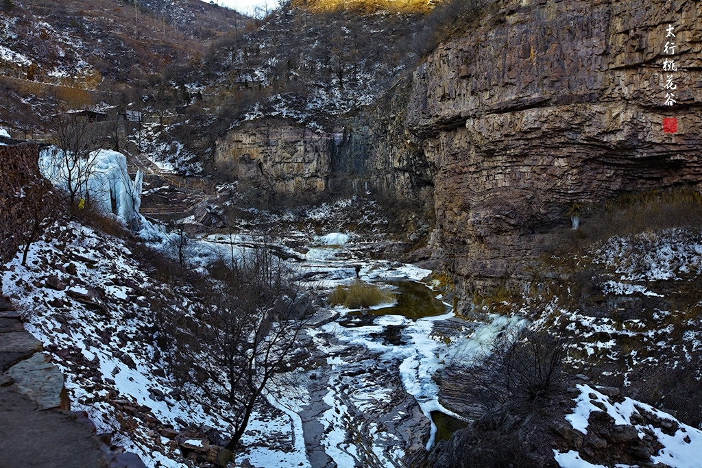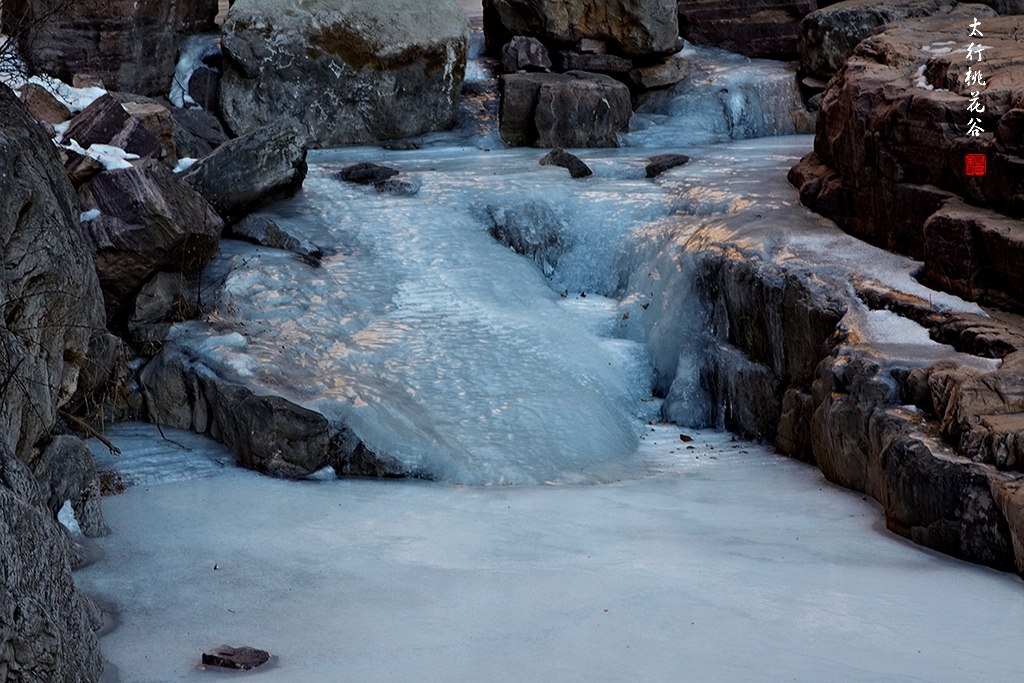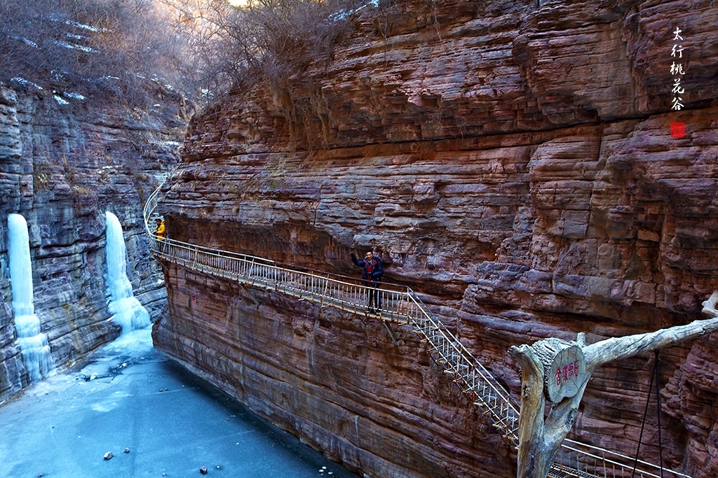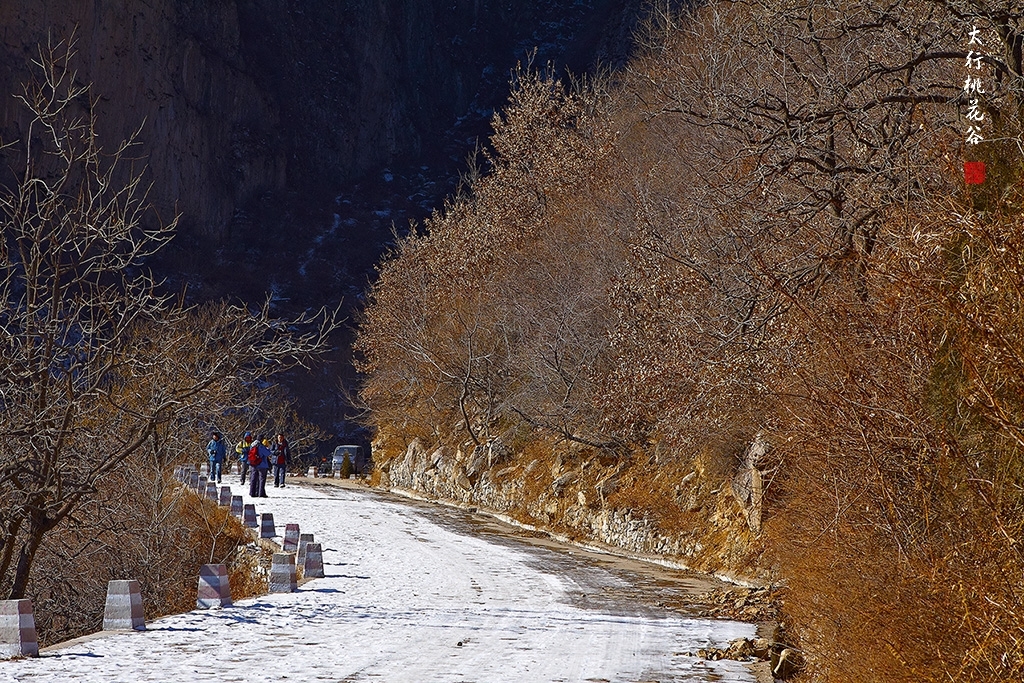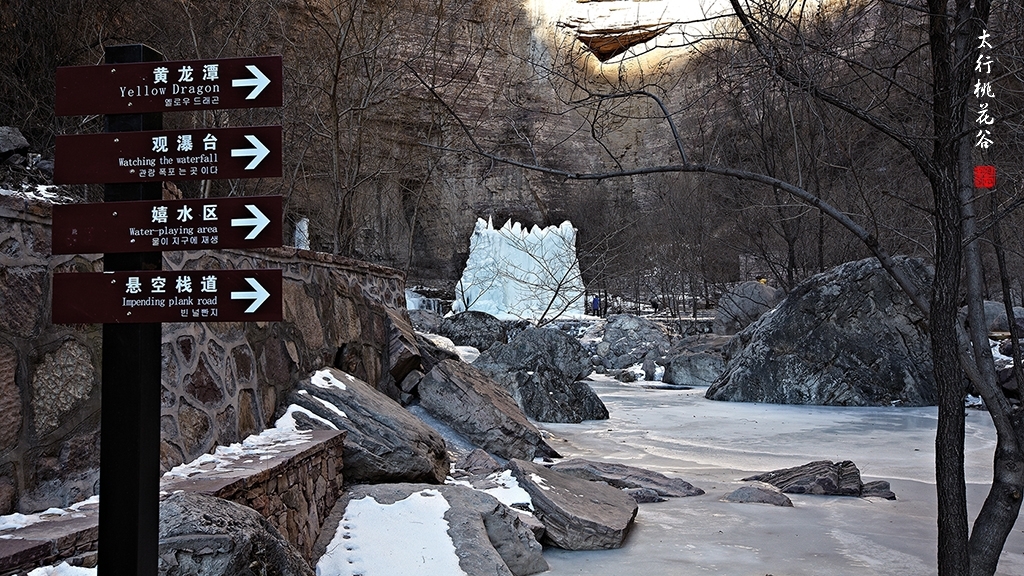 2013年1月12日早上8:30,在岗顶居版主的带领下,我们租入住的农家乐老板的面包车从石板岩乡出发,约9点进入了桃花谷景区。进入景区大门以后,有工作人员提醒一些道路上浮冰没有清除,若无法通过,可以折返回来,从公路向上进入桃花谷。太行山中的桃花谷是一条谷中之谷,从黄龙潭处分岔进入,流传着很多美丽的传说。全长7公里,狭窄处仅有20米,落差愈千米。一条蜿蜒曲折的桃花溪水贯穿峡谷,在冬季形成了冰瀑悬挂在两岸绝壁之上。若从公路进入景区,就看不到谷中谷那壮美的景色了,只能在谷中谷的出口处看到路边的冰瀑。我们是为了探美拍冰瀑而来,一定要克服困难从谷中谷穿越。