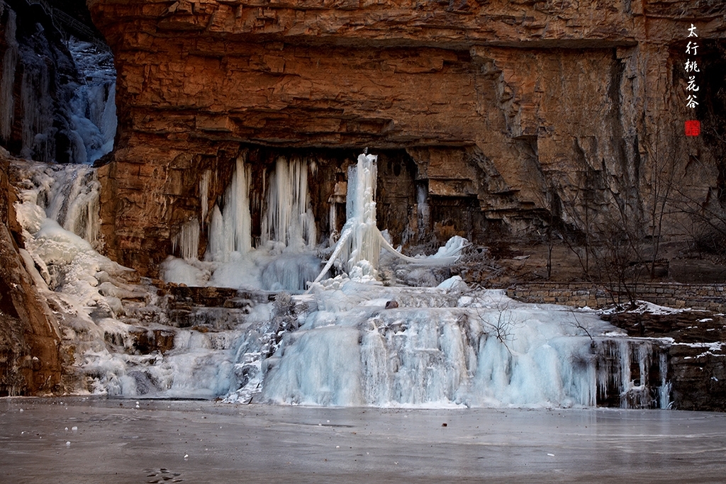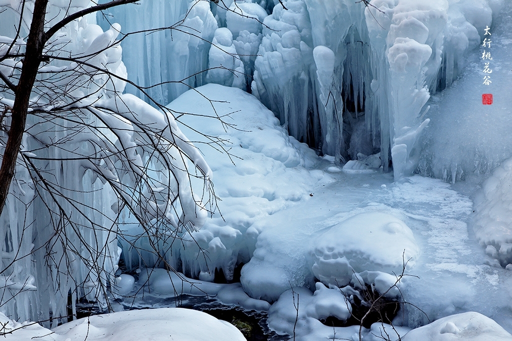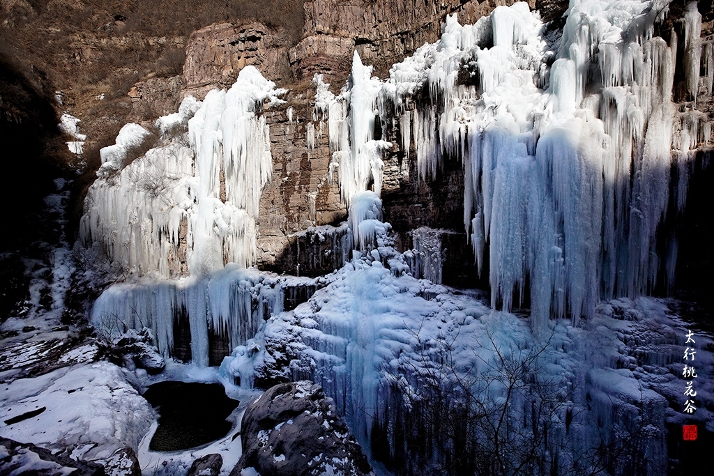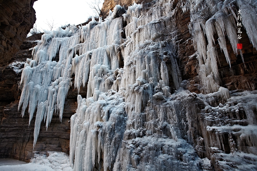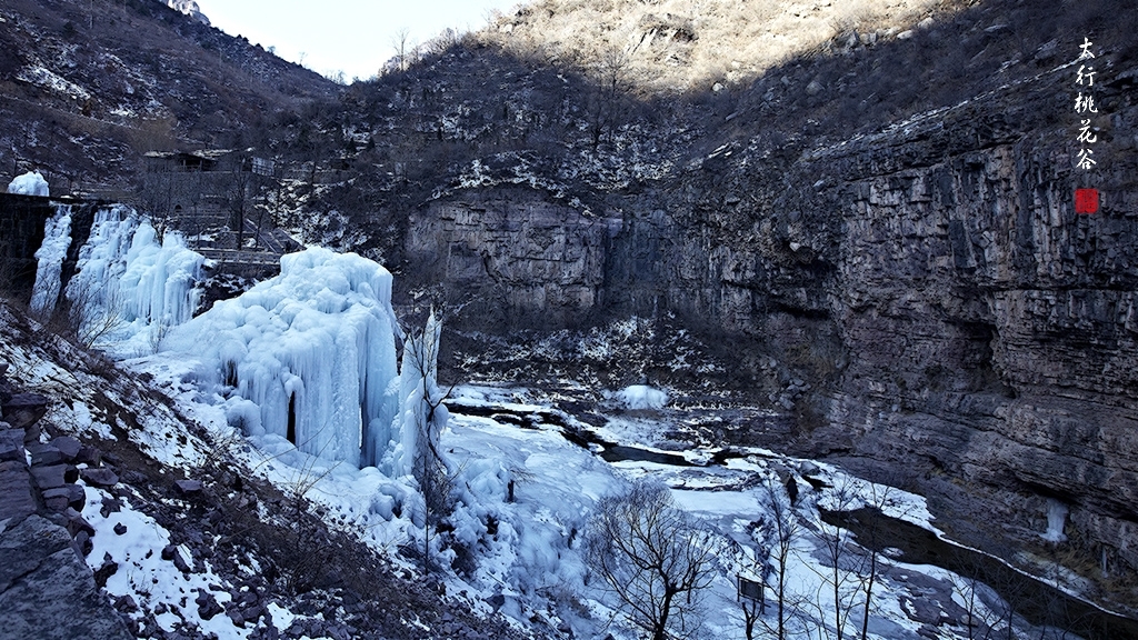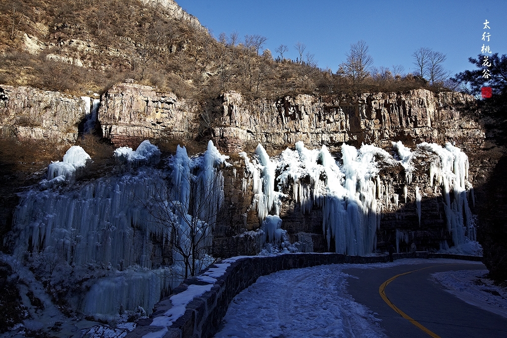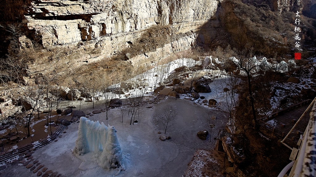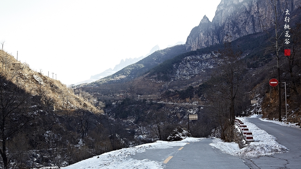 2013年1月12日早上8:30,在岗顶居版主的带领下,我们租入住的农家乐老板的面包车从石板岩乡出发,约9点进入了桃花谷景区。进入景区大门以后,有工作人员提醒一些道路上浮冰没有清除,若无法通过,可以折返回来,从公路向上进入桃花谷。太行山中的桃花谷是一条谷中之谷,从黄龙潭处分岔进入,流传着很多美丽的传说。全长7公里,狭窄处仅有20米,落差愈千米。一条蜿蜒曲折的桃花溪水贯穿峡谷,在冬季形成了冰瀑悬挂在两岸绝壁之上。若从公路进入景区,就看不到谷中谷那壮美的景色了,只能在谷中谷的出口处看到路边的冰瀑。我们是为了探美拍冰瀑而来,一定要克服困难从谷中谷穿越。