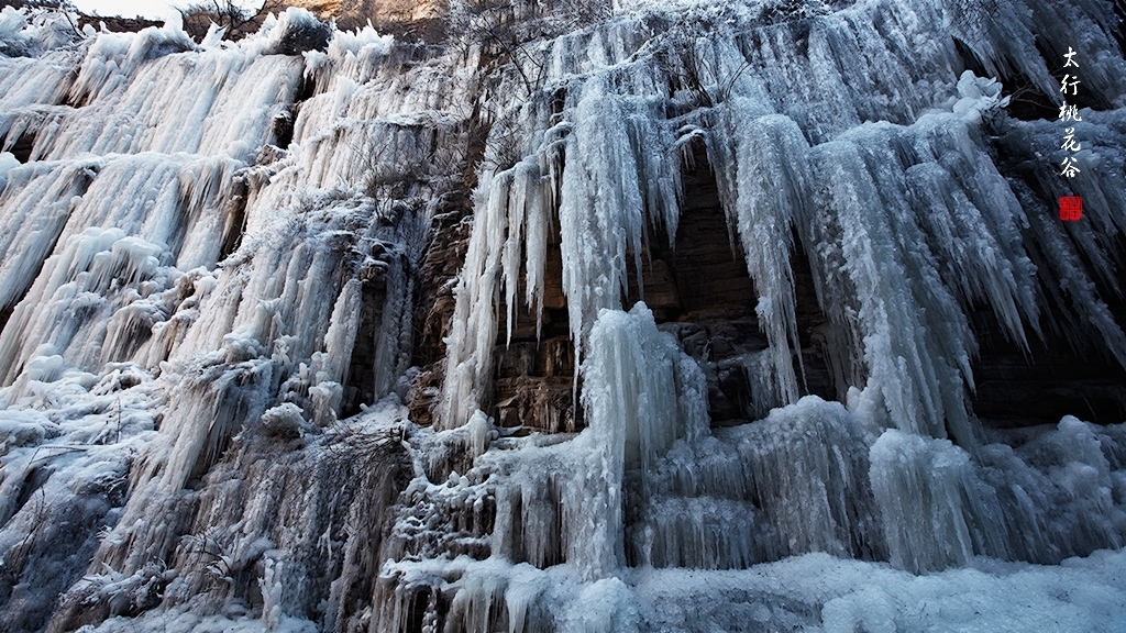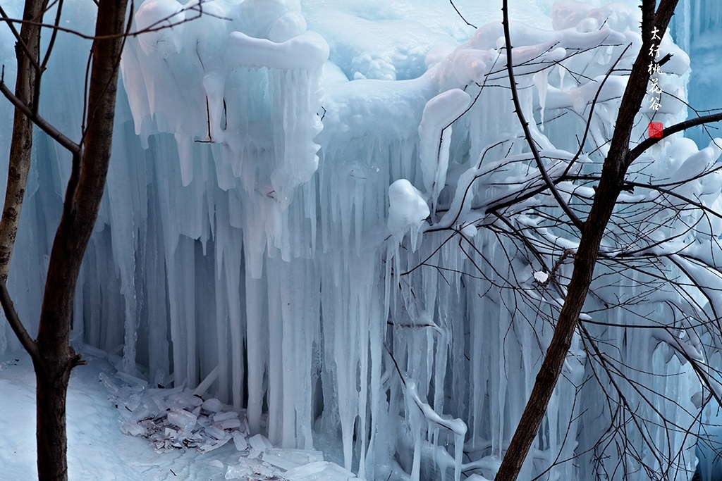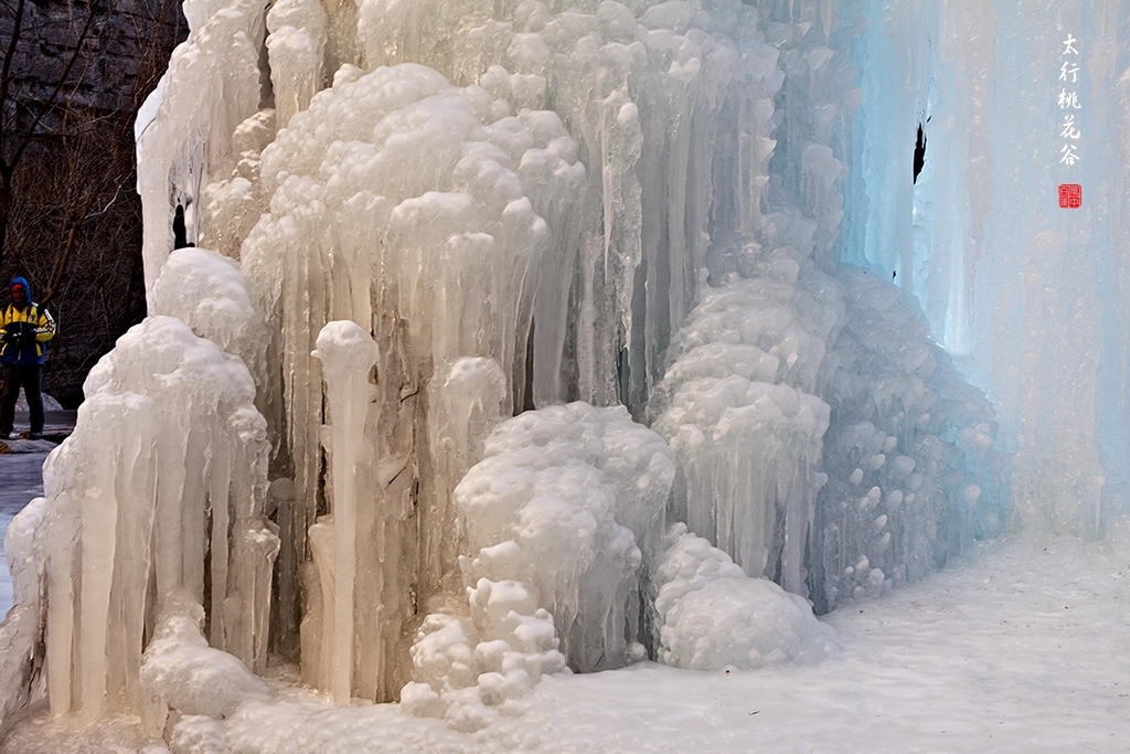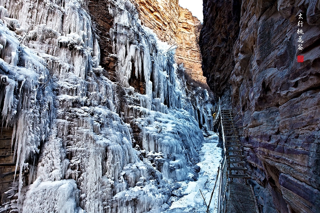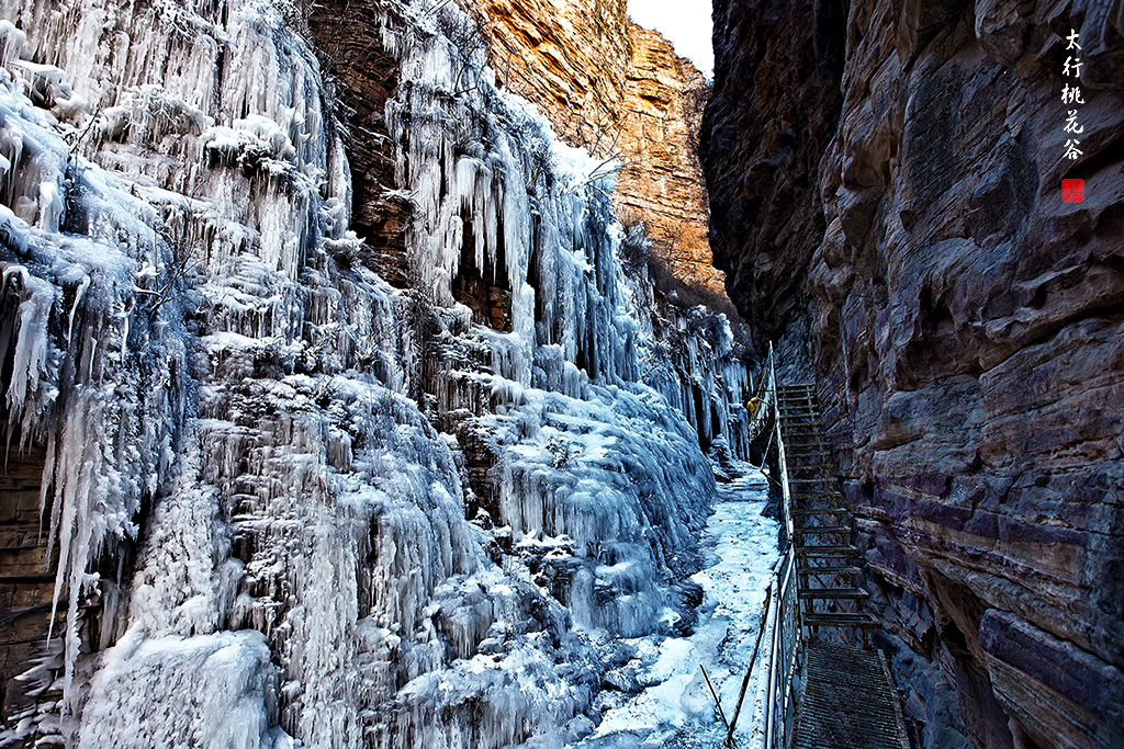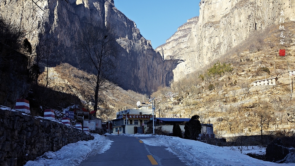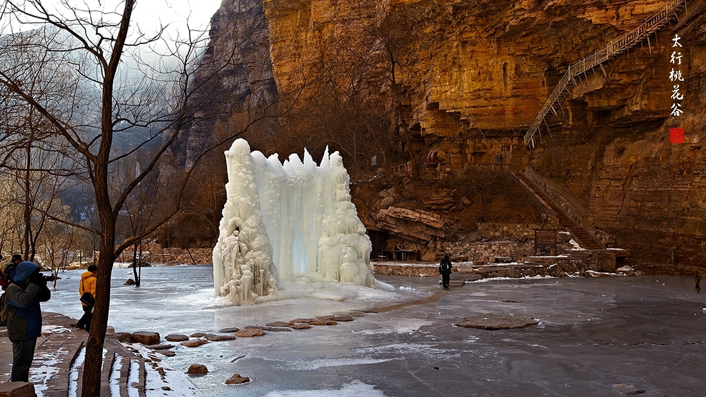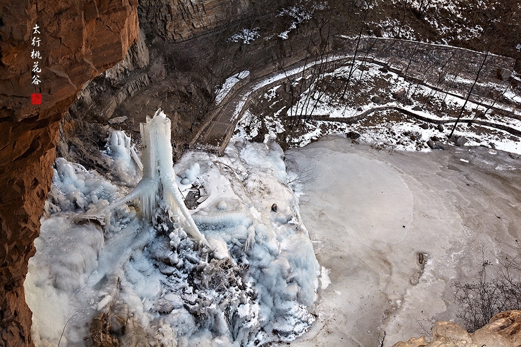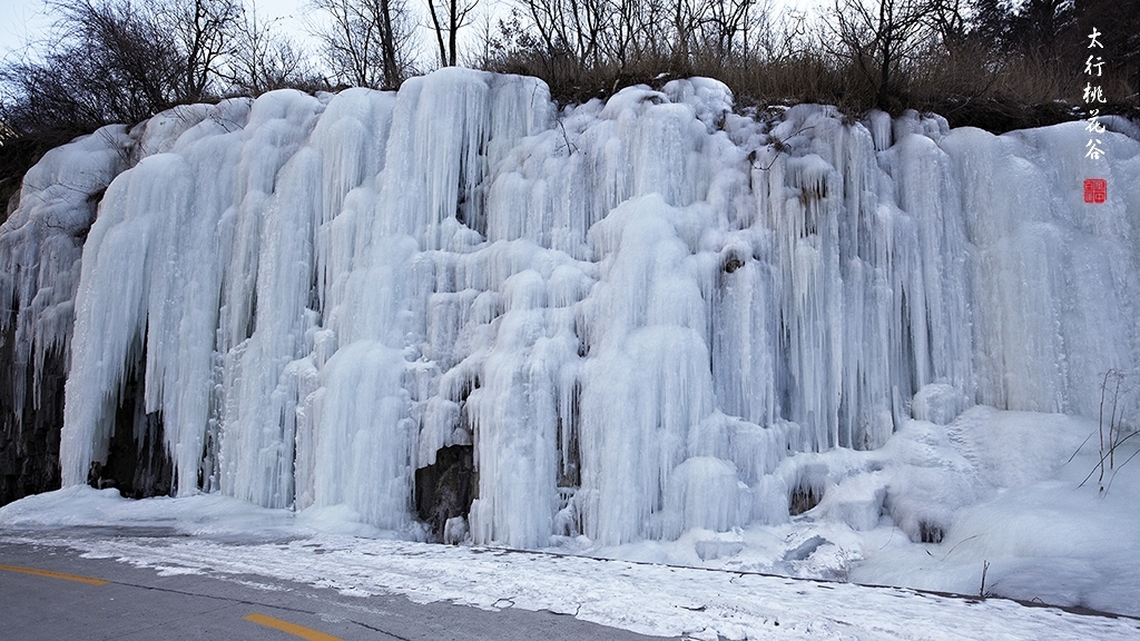 2013年1月12日早上8:30,在岗顶居版主的带领下,我们租入住的农家乐老板的面包车从石板岩乡出发,约9点进入了桃花谷景区。进入景区大门以后,有工作人员提醒一些道路上浮冰没有清除,若无法通过,可以折返回来,从公路向上进入桃花谷。太行山中的桃花谷是一条谷中之谷,从黄龙潭处分岔进入,流传着很多美丽的传说。全长7公里,狭窄处仅有20米,落差愈千米。一条蜿蜒曲折的桃花溪水贯穿峡谷,在冬季形成了冰瀑悬挂在两岸绝壁之上。若从公路进入景区,就看不到谷中谷那壮美的景色了,只能在谷中谷的出口处看到路边的冰瀑。我们是为了探美拍冰瀑而来,一定要克服困难从谷中谷穿越。