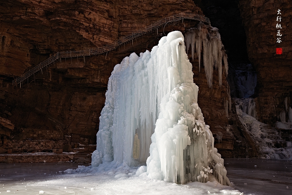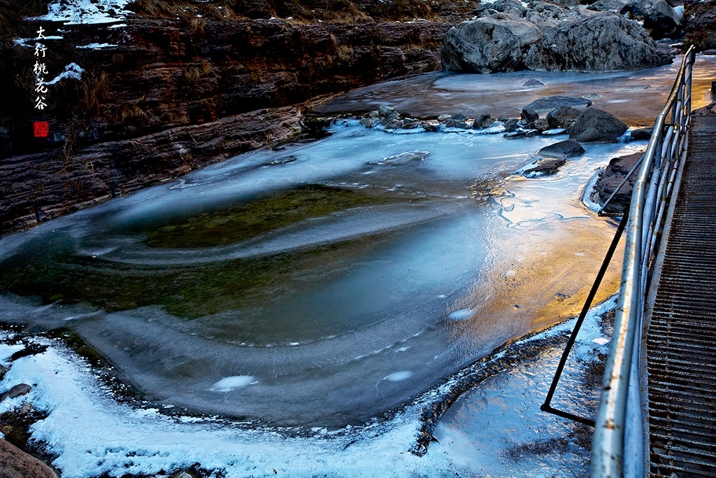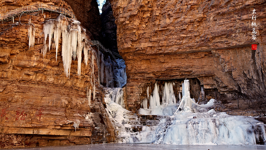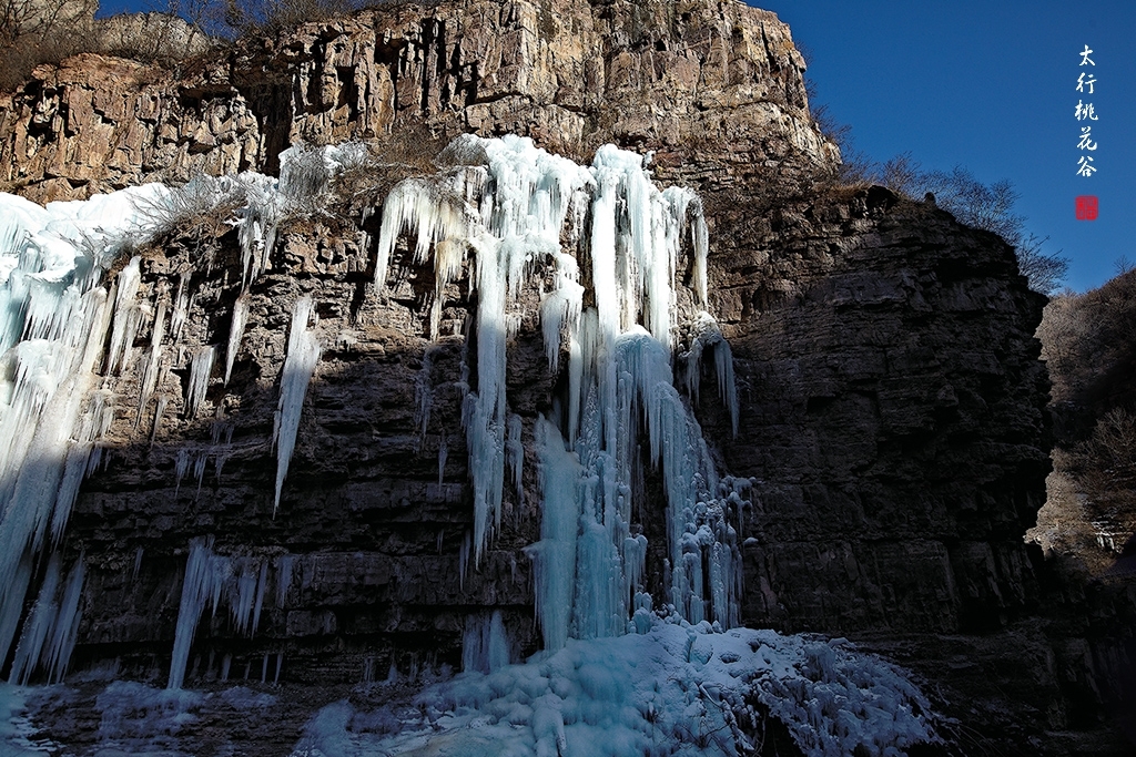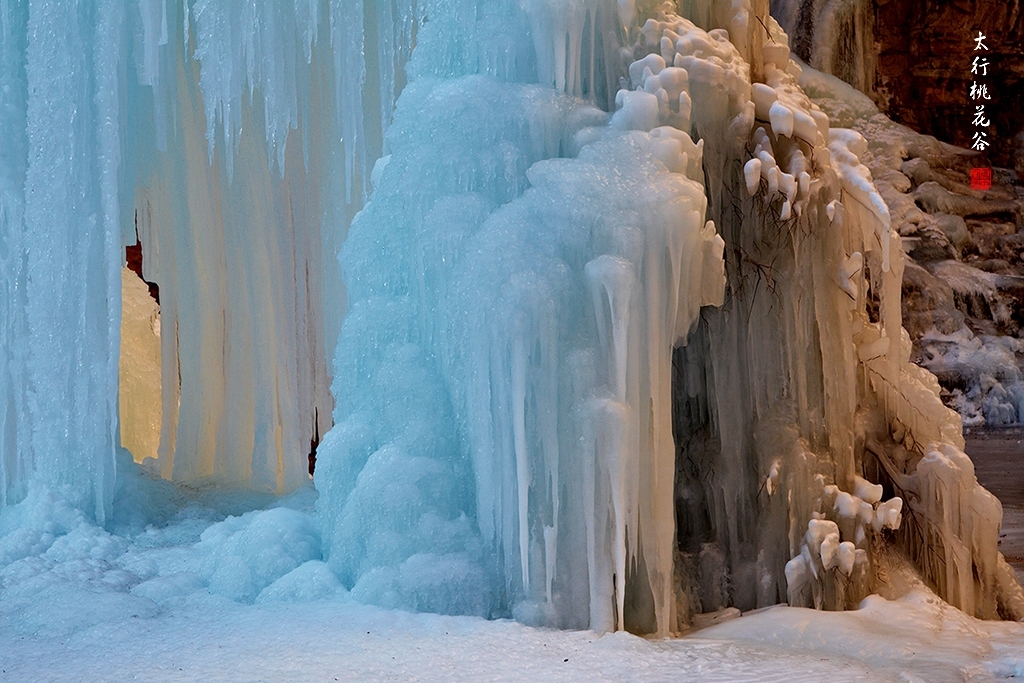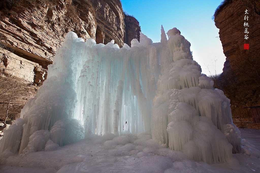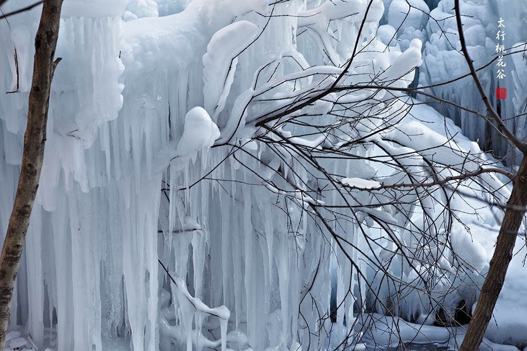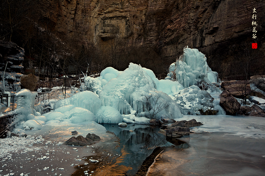 2013年1月12日早上8:30,在岗顶居版主的带领下,我们租入住的农家乐老板的面包车从石板岩乡出发,约9点进入了桃花谷景区。进入景区大门以后,有工作人员提醒一些道路上浮冰没有清除,若无法通过,可以折返回来,从公路向上进入桃花谷。太行山中的桃花谷是一条谷中之谷,从黄龙潭处分岔进入,流传着很多美丽的传说。全长7公里,狭窄处仅有20米,落差愈千米。一条蜿蜒曲折的桃花溪水贯穿峡谷,在冬季形成了冰瀑悬挂在两岸绝壁之上。若从公路进入景区,就看不到谷中谷那壮美的景色了,只能在谷中谷的出口处看到路边的冰瀑。我们是为了探美拍冰瀑而来,一定要克服困难从谷中谷穿越。