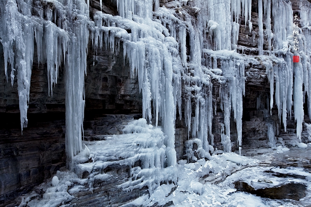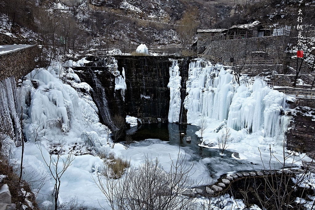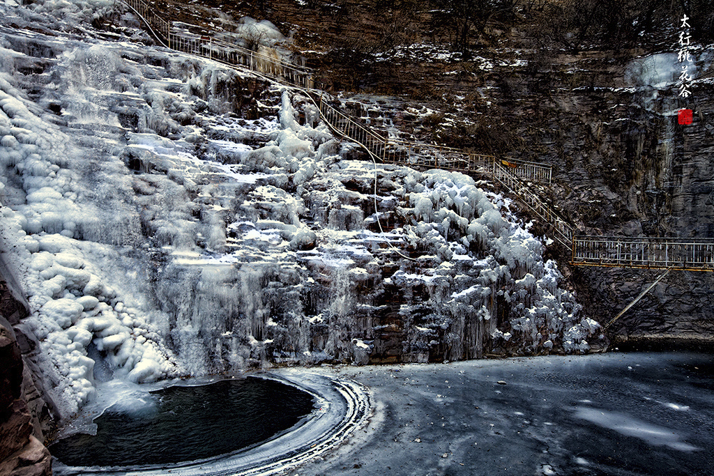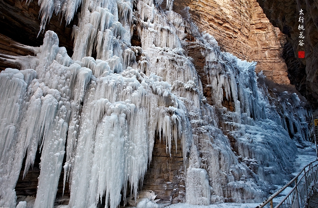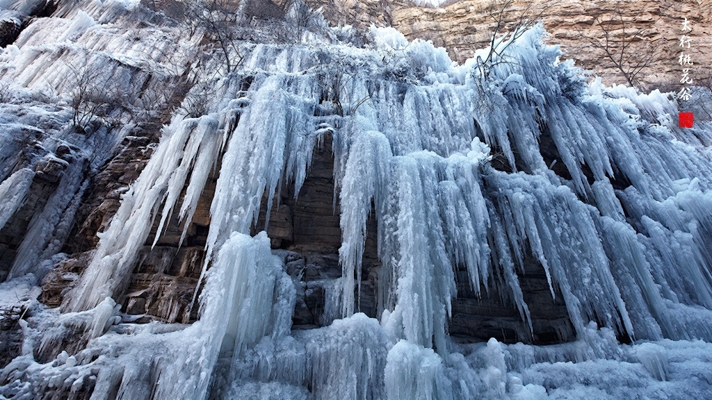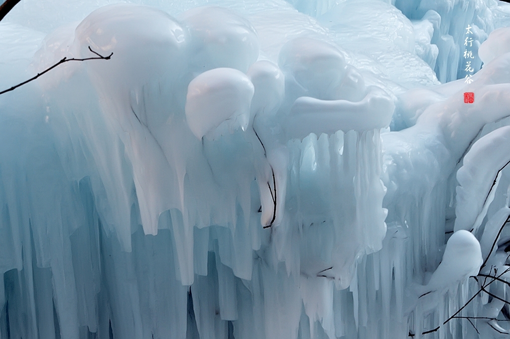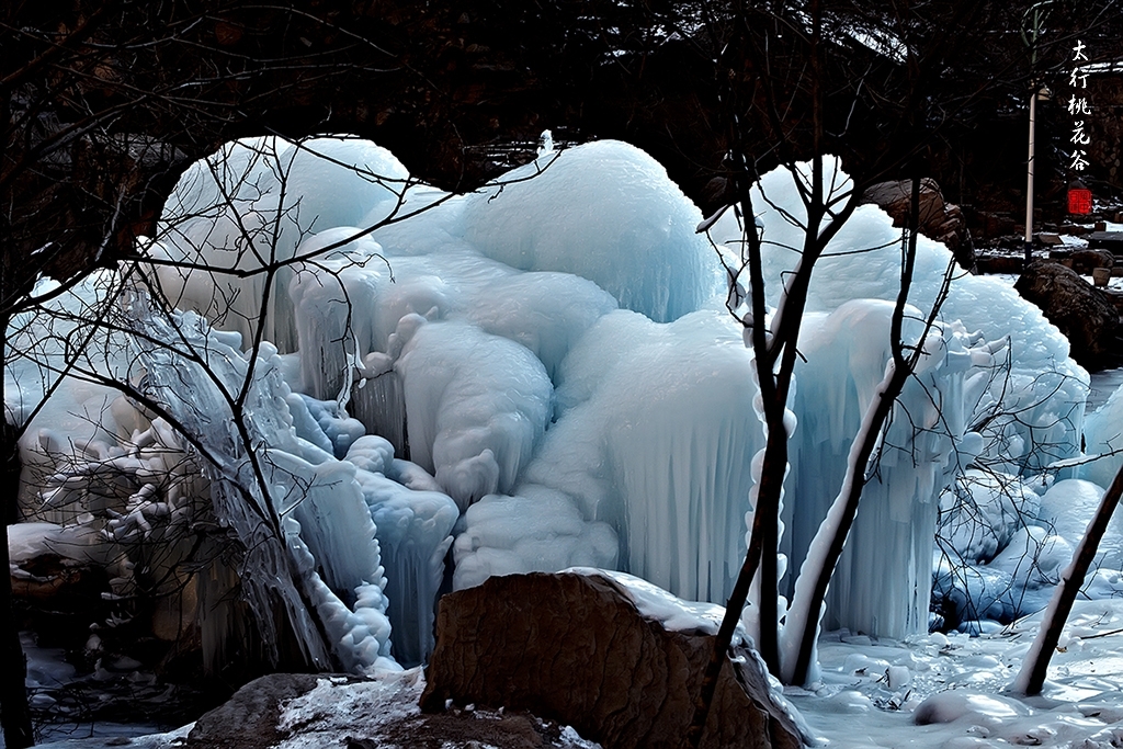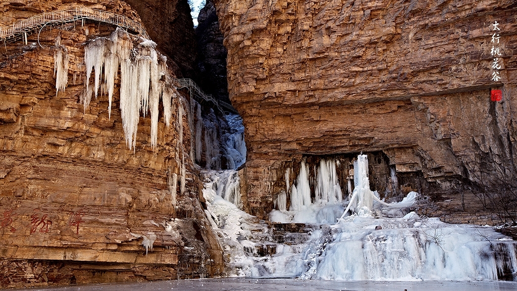 2013年1月12日早上8:30,在岗顶居版主的带领下,我们租入住的农家乐老板的面包车从石板岩乡出发,约9点进入了桃花谷景区。进入景区大门以后,有工作人员提醒一些道路上浮冰没有清除,若无法通过,可以折返回来,从公路向上进入桃花谷。太行山中的桃花谷是一条谷中之谷,从黄龙潭处分岔进入,流传着很多美丽的传说。全长7公里,狭窄处仅有20米,落差愈千米。一条蜿蜒曲折的桃花溪水贯穿峡谷,在冬季形成了冰瀑悬挂在两岸绝壁之上。若从公路进入景区,就看不到谷中谷那壮美的景色了,只能在谷中谷的出口处看到路边的冰瀑。我们是为了探美拍冰瀑而来,一定要克服困难从谷中谷穿越。