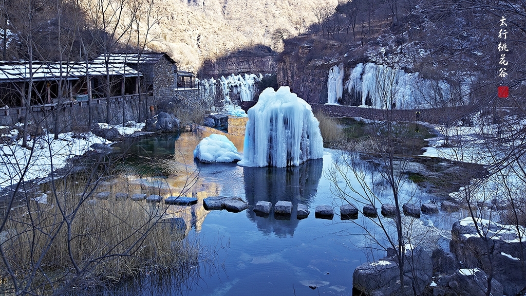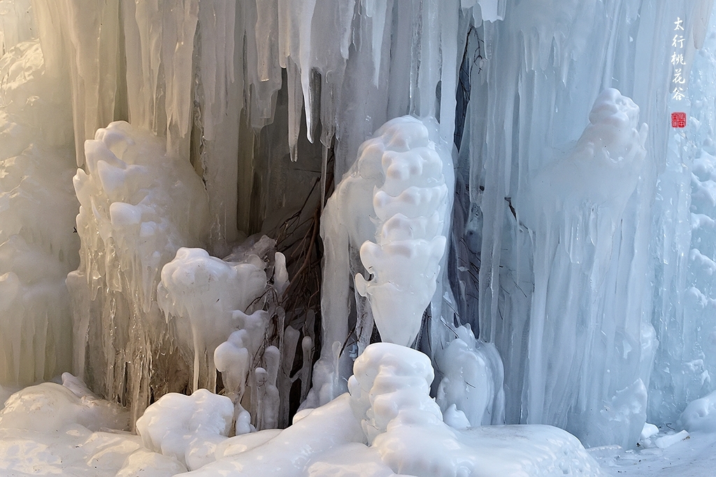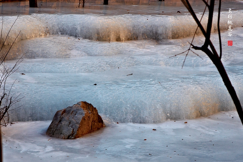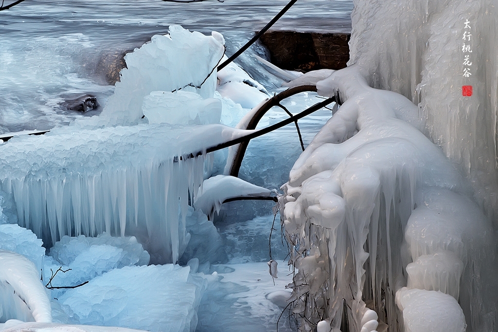 严冬中的桃花谷,到处是一片剔透的冰雪世界。桃花溪流水水潺潺在冰下流过,如琴弦弹奏着高山流水,仙音袅袅;阳光洒向这形态各异的冰挂冰瀑,似琼楼玉宇,璀璨晶莹。其中滋味很难用语言尽述。雪水中屹立的冰雕形态各异美不胜收,水中倒影清澈精美,山染金黄光影璀璨。7位五龄后如回到了焕发了青春,赞叹着,欢呼着,如痴入迷,如醉如狂,按不完的快门,摄不尽的美景。